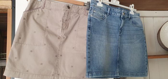 2 jupes, une en coton, l'autre en jean. Taille 40. Taille bien. Très bon état.