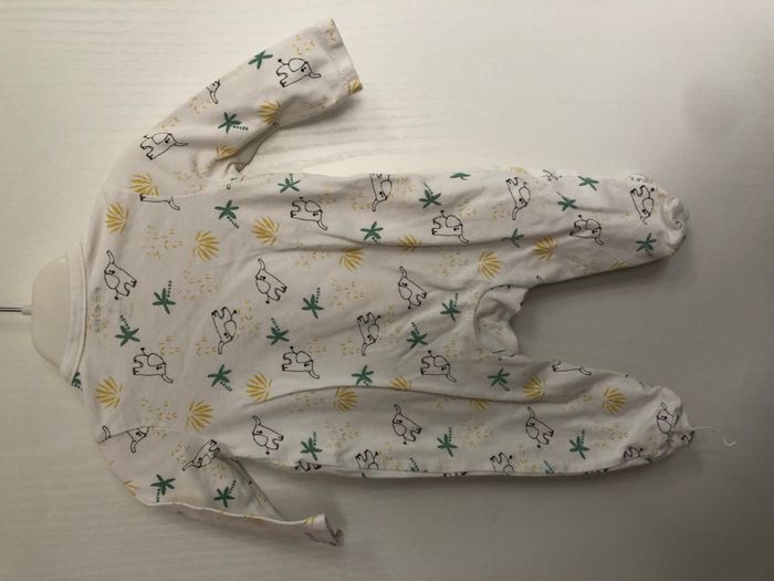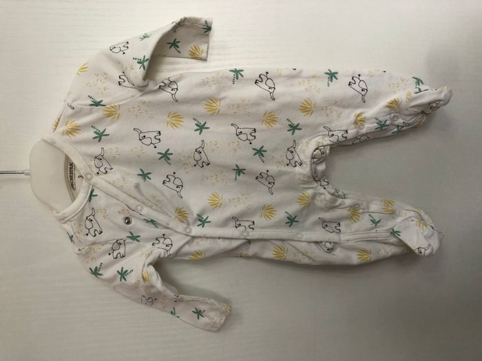 Jolie grenouillère légère avec ouverture à l'avant. Motif éléphants et palmiers. Marque Orchestra Taille 3 mois, 60 cm
