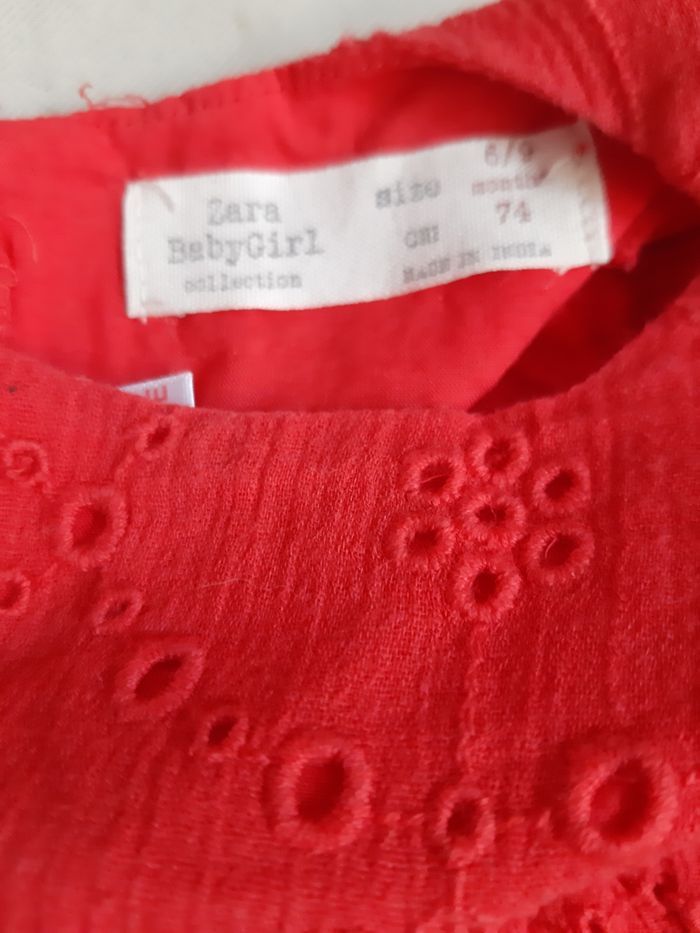 robe d'été rouge, de la marque Zara, en taille 9 mois (74 cm) fermeture par boutons dans le dos 100 % coton En très bon état. Remise en main propre possible dans le secteur de Pont-Audemer / Beuzeville / Pont-l’Evêque. Envoi possible.