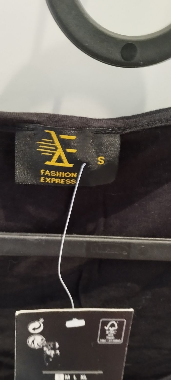 Bonjour, Je vends ce t-shirt MC pour femme en taille S de la marque fashion express neuf avec étiquette