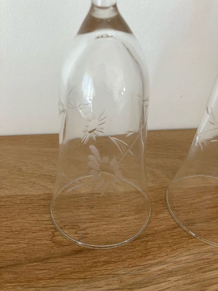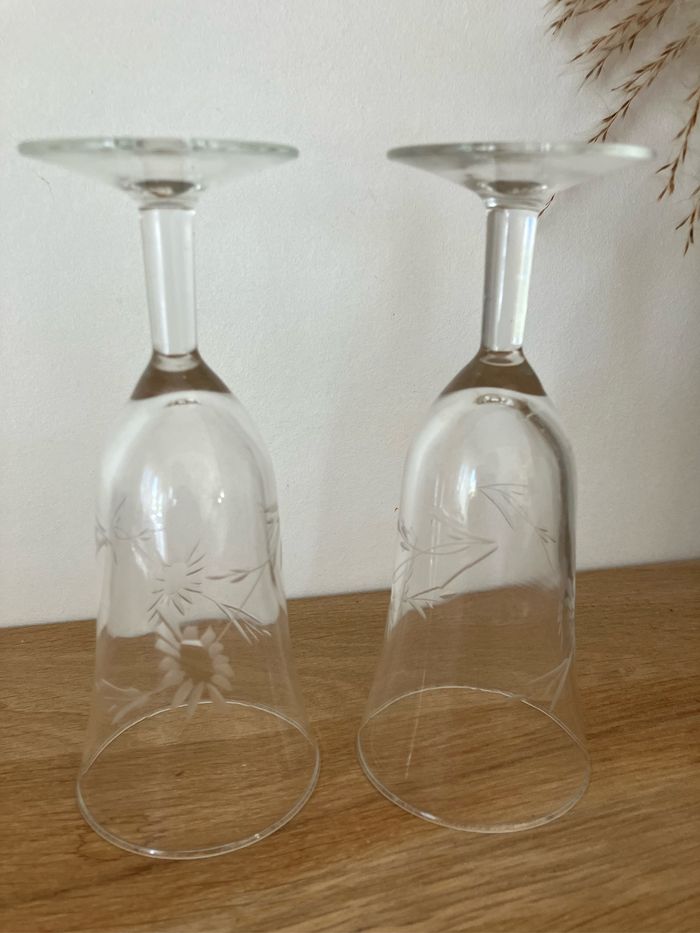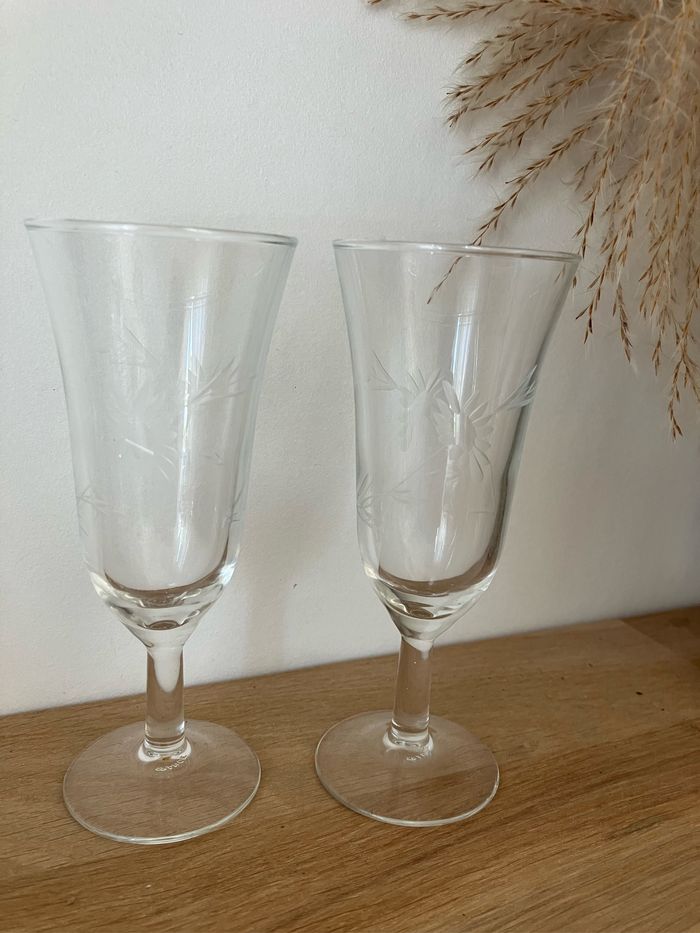 Ce lot comporte 2 petites flûtes à champagne avec motif floral incrusté. Elles sont en bon état : ni fêlées, ni ébréchées. Dimensions : - hauteur : 15 cm -Diamètre : pied : 5 cm/ Verre : 6 cm
