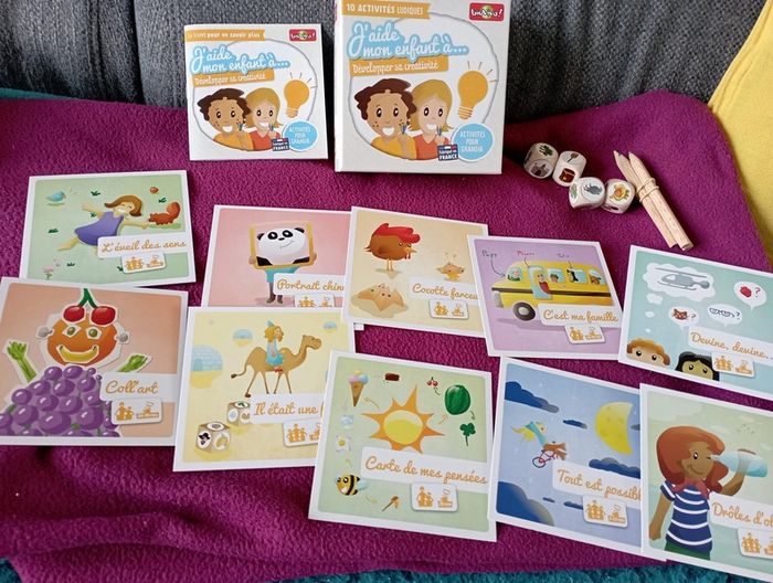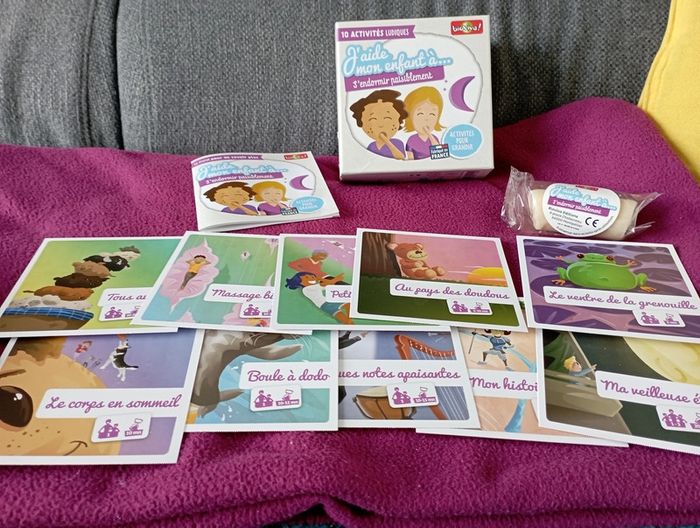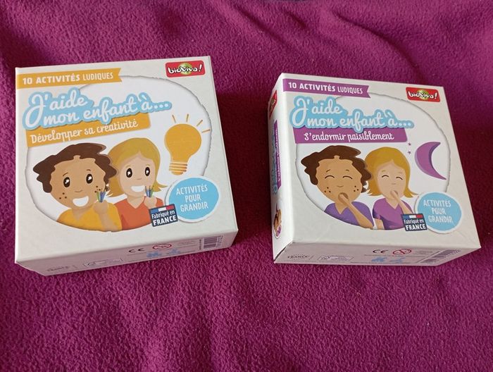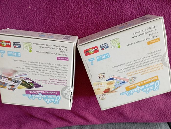 Un jeu pour aider son enfant à développer sa créativité .En très bon état et complet. Un autre jeu j'aide mon enfant à s'endormir paisiblement.En très bon état on l'a juste ouvert et on ne n'a jamais utilisé.La pâte à modeler est encore dans son emballage mais je ne peux pas dire si elle est utilisable.