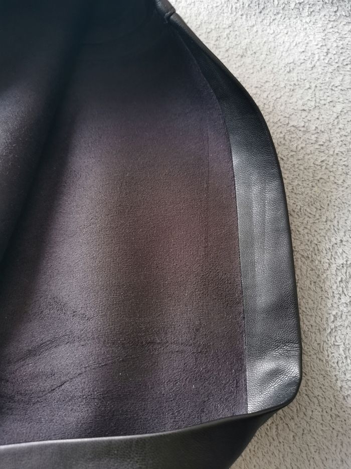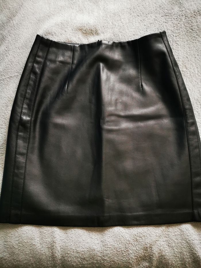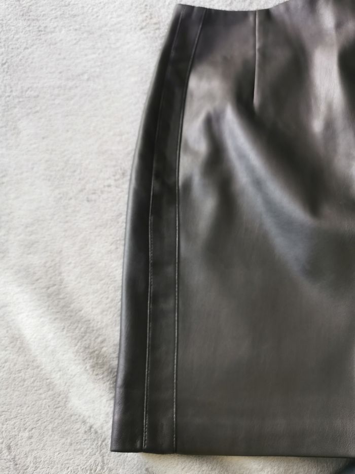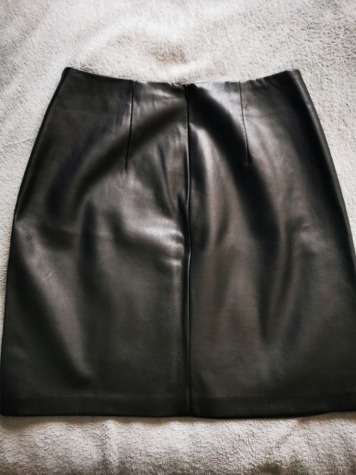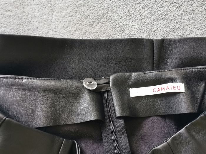 Jupe Camaïeu effet cuir avec traits sur les côtés, intérieur daim tout doux, taille 36.