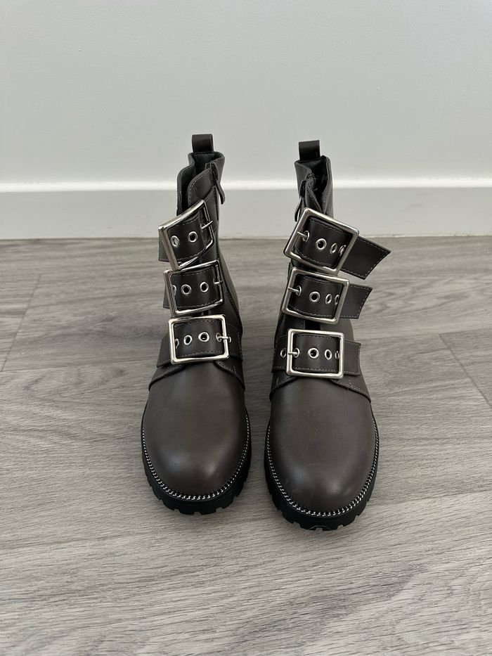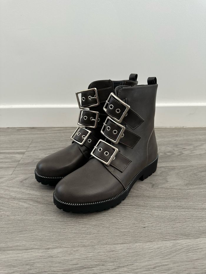 Bottines - Neuves avec étiquette - Grises et argentées - Pointure 38 - Bijouteries argentée - Semelles noires - Couleur grise - 3 brides décoratives - Se ferme avec un zip à l’intérieur - Liseré argenté au niveau de la semelle - Style rock, punk, emo, goth