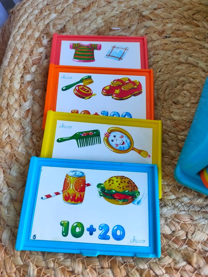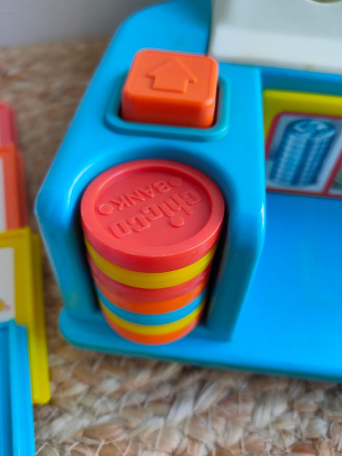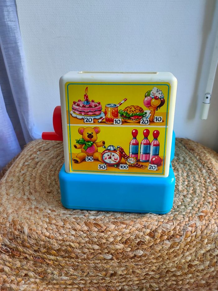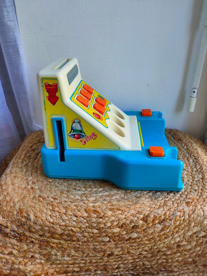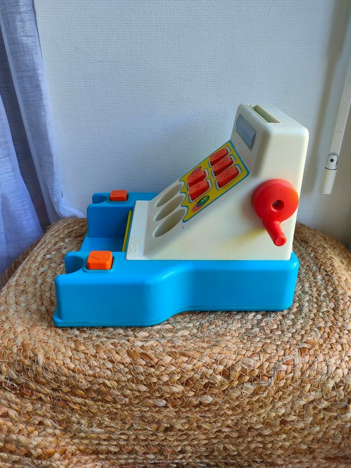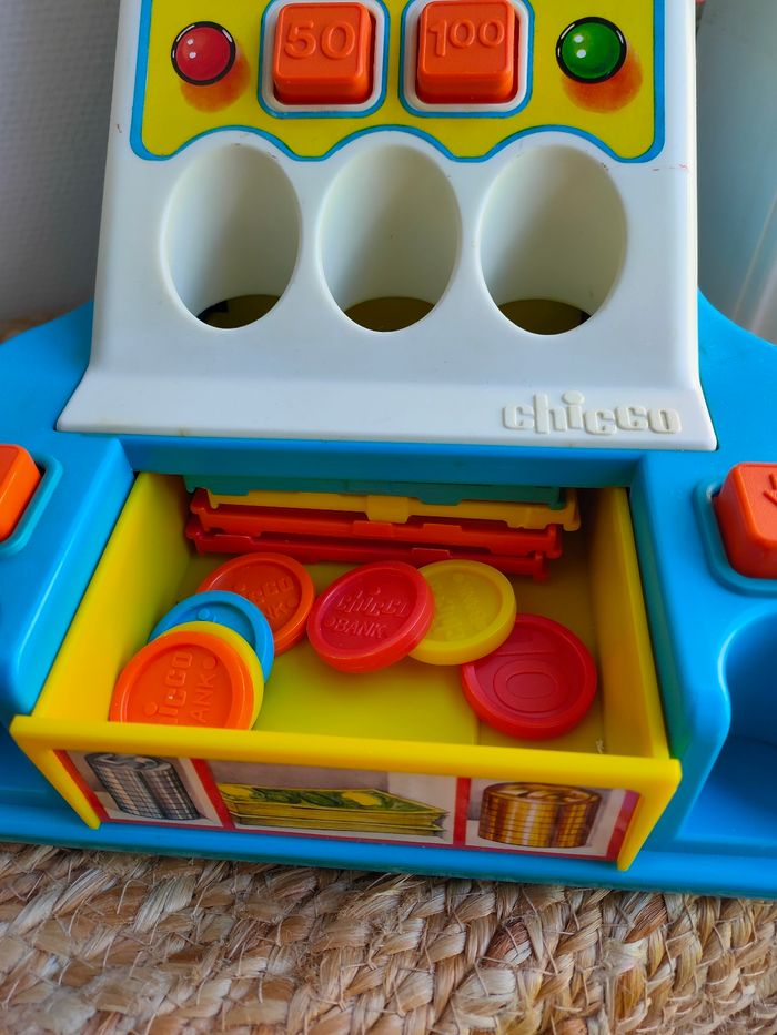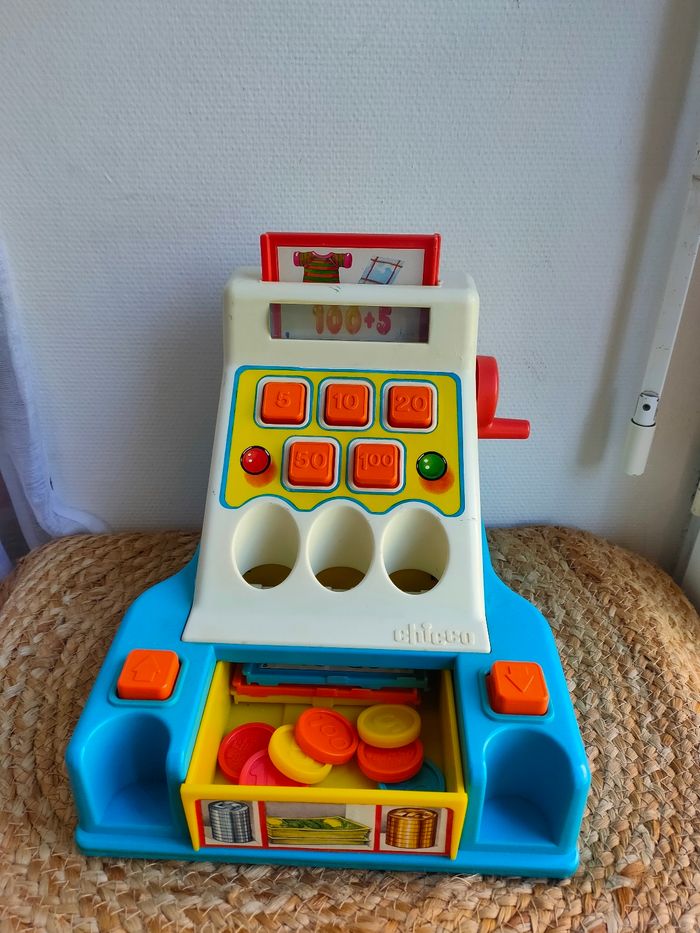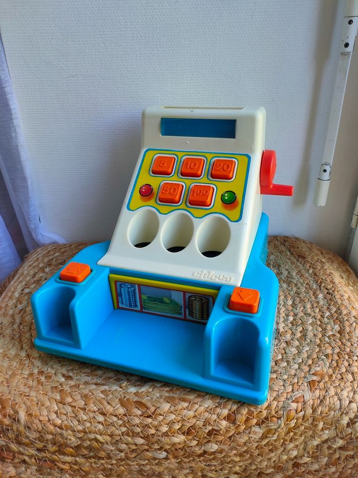 Caisse enregistreuse vintage marque Chicco, Vendu avec quelques pièces Chicco bank et des étiquettes prix. Tout est fonctionnel sans piles. L'ouverture du tiroir caisse est capricieux avec le bouton mais s'ouvre avec les mains. Un jolie jeu vintage rare a la vente dans cette état. Les couleurs ont passé avec le temps.