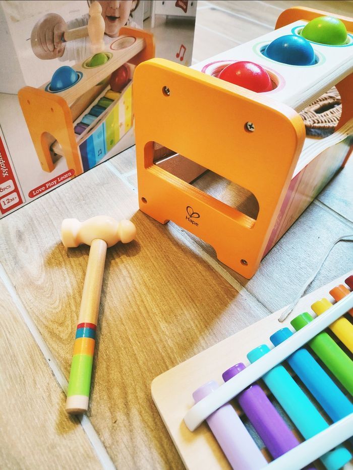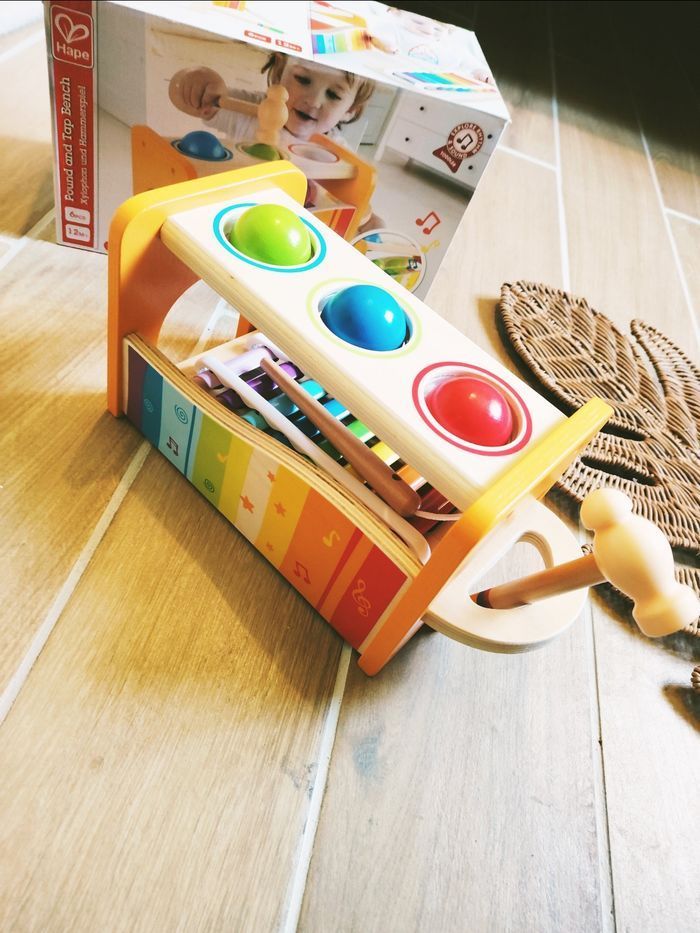 🎀Superbe Pound and Tap Bench de la marque Hape, un jouet en bois incontournable pour les tout-petits. Récompensé par plusieurs prix, il offre deux façons de jouer pour stimuler l'ouïe et la coordination.