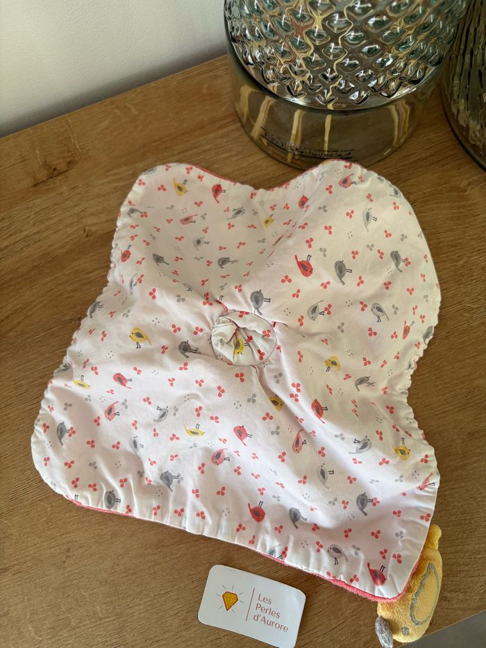 Doudou chat blanc rose Oiseau jaune Motifs oiseaux Obaibi Bon état Réf : D1