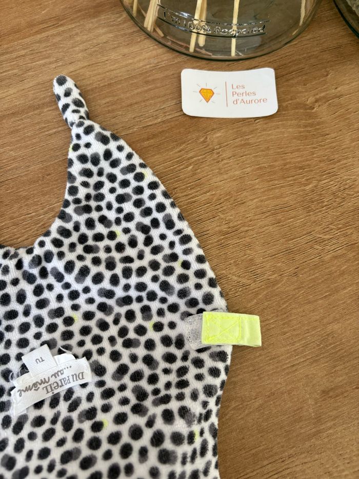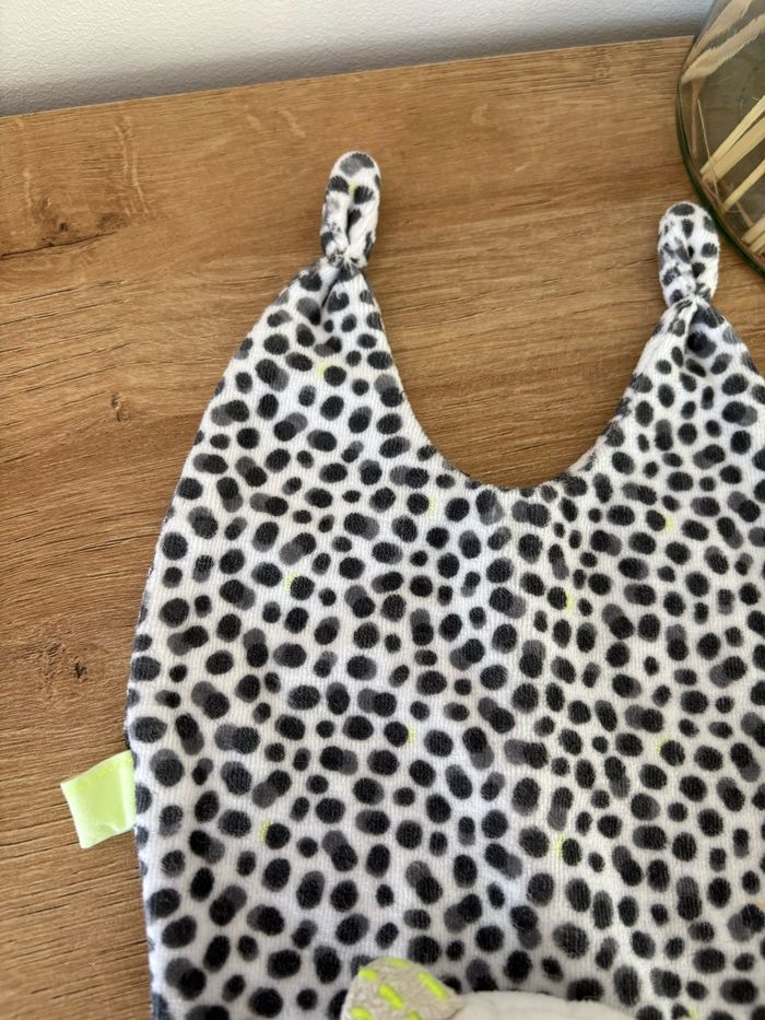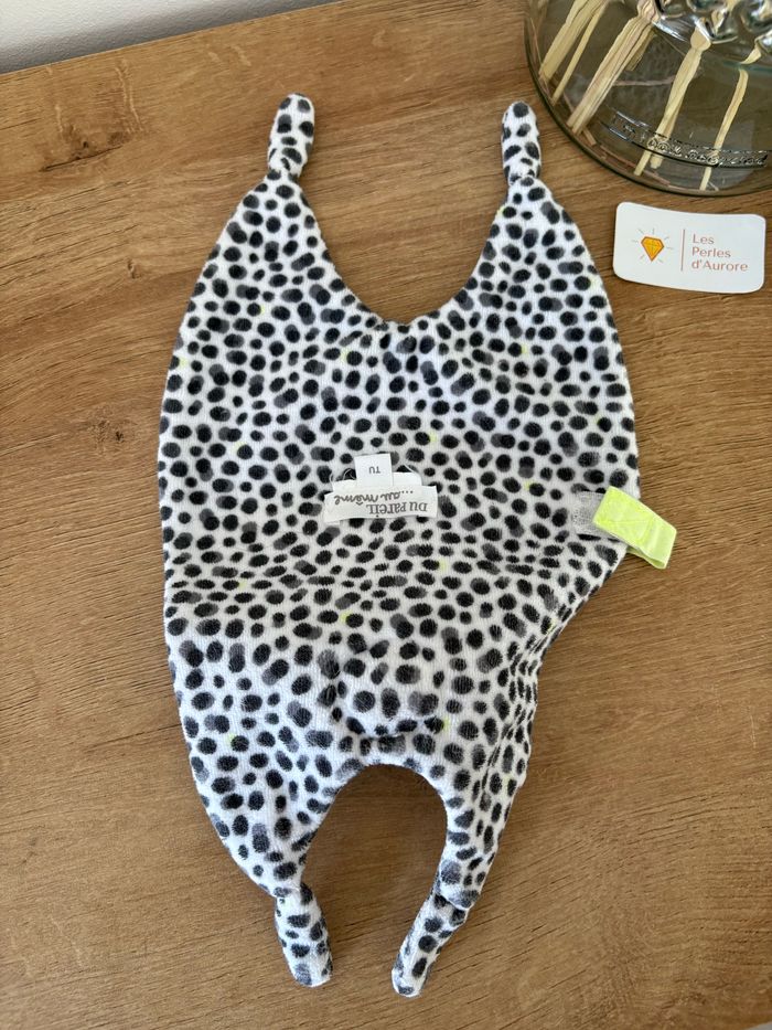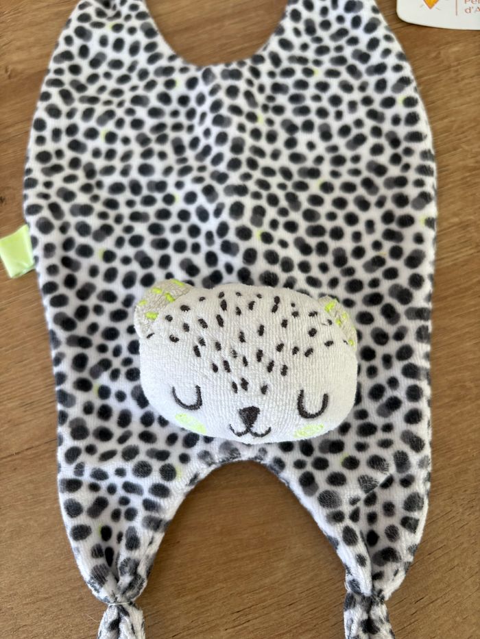 Doudou plat léopard tacheté gris Attache tétine / sucette Très bon état Étiquette partiellement coupée Réf : D1
