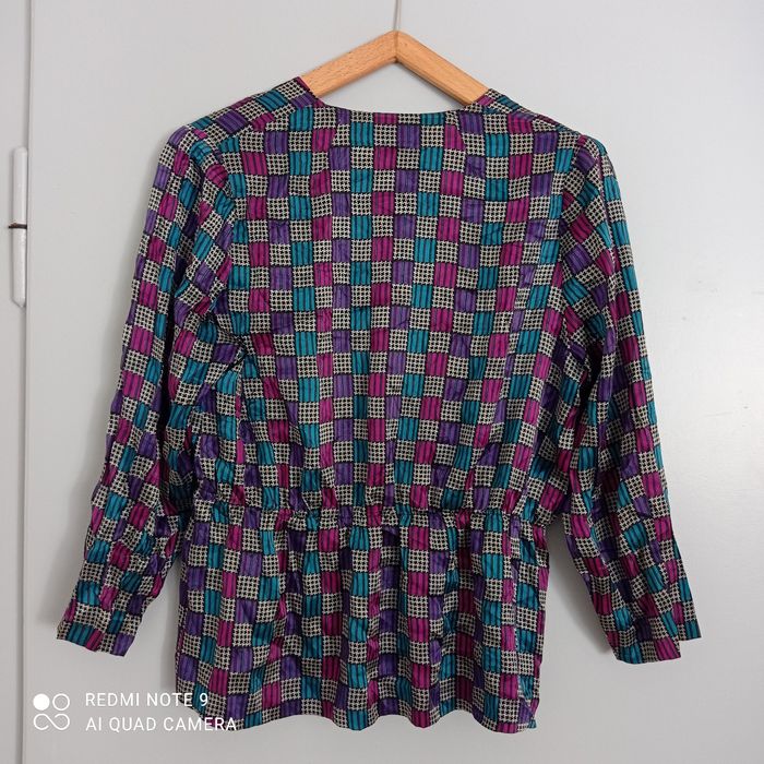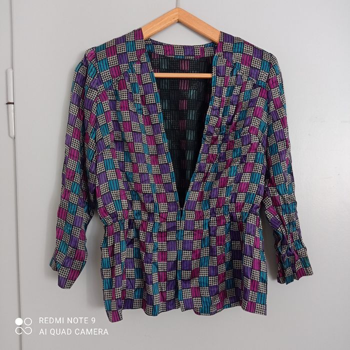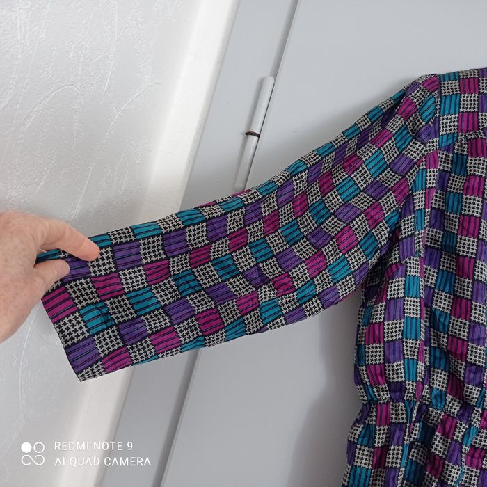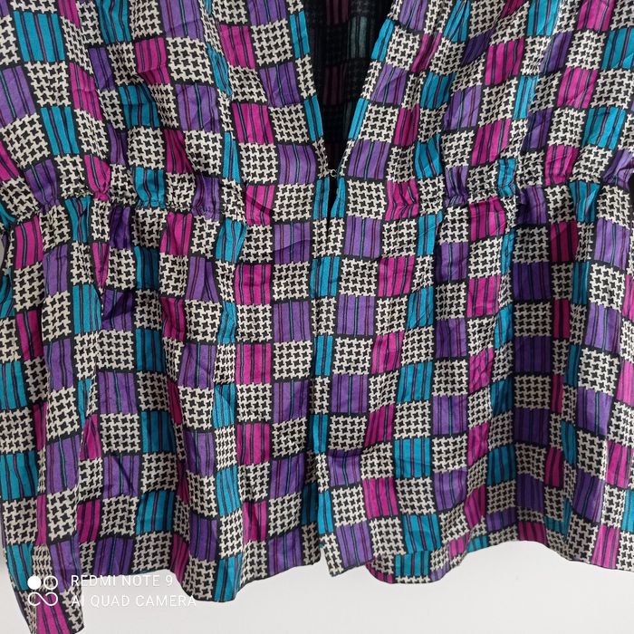Motifs géométriques. Joli décolleté. Taille estimée. Mesures prises à plat : épaules : 41cm, aisselles : 47cm, longueur : 59cm. C2