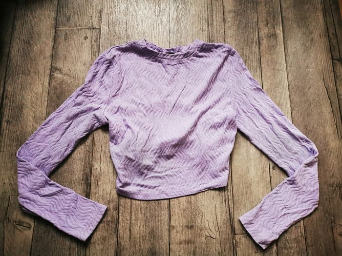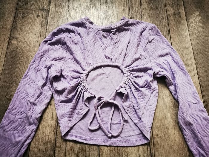 Top court taille S 38/40 mais correspond à un 36, couleur violet pastel avec rond dans le dos, tissus pull fin.
