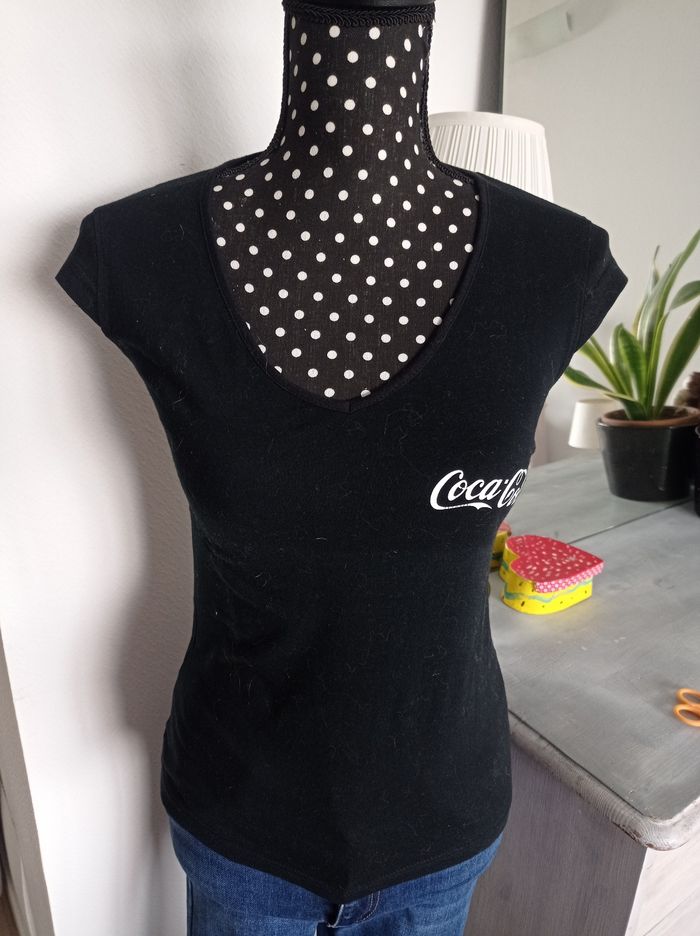 Remise sur lot activé. T-shirt noir, col en V. En très bon état. Marque: Coca-Cola Taille : M(38) ⚠️mais elle taille petite, je dirais plutôt taille S(36) Mesures approximatives Longueur: 57cm Aisselle a aisselle: 40cm Épaule a épaule: 36cm 100% Coton #tshirtfemme #tshirtnoir36 #tshirtnoirfemme #tshirtcolv #tshirtcocacola #tshirtcocacola36 #cocacola