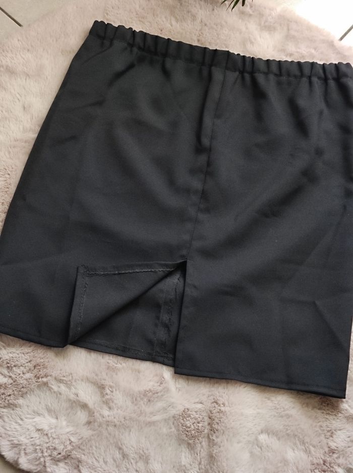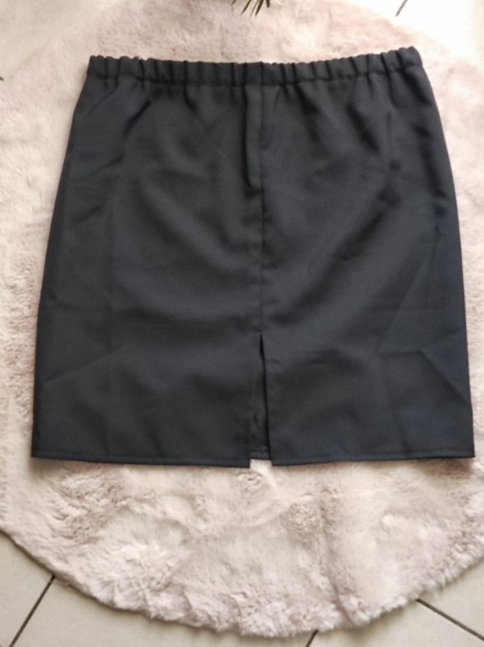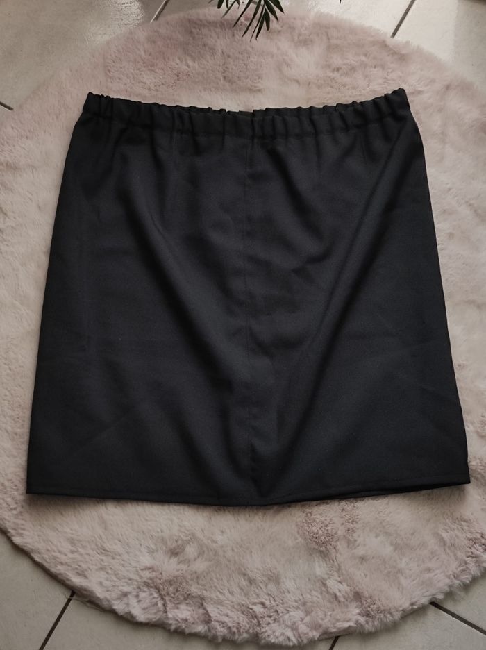 jupe courte noire échancrée à l'arrière, taille élastique. Dimensions Tour de taille 46 a 56 max Tour de hanches 57 cm Hauteur 55 cm En parfait état