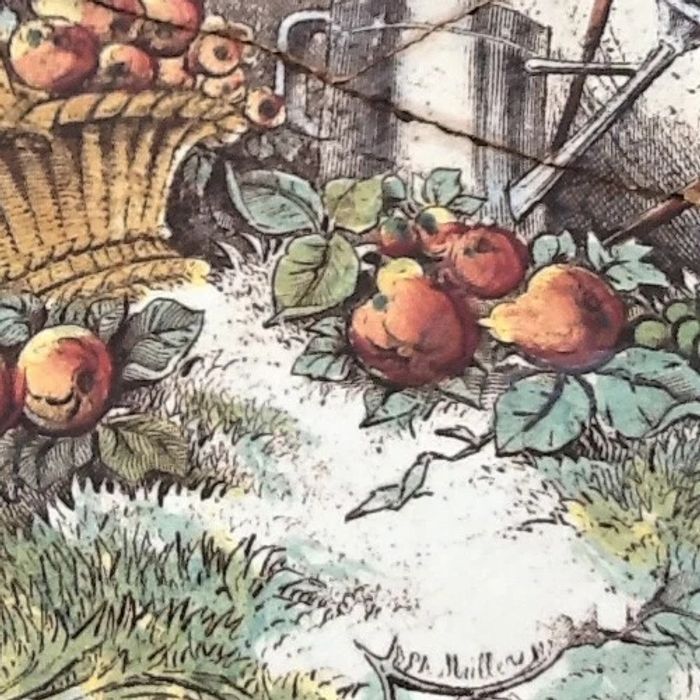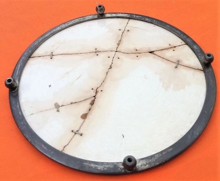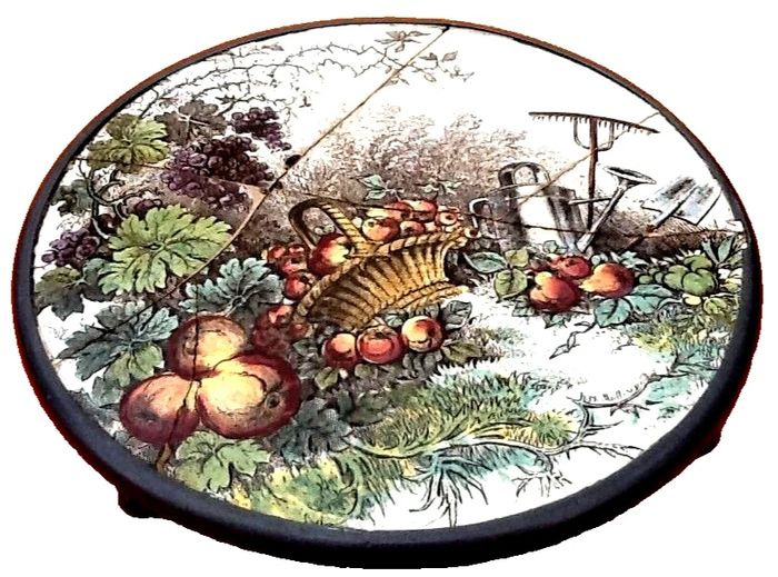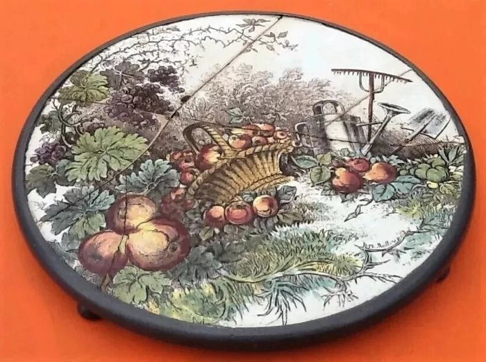 (article vendu en l' état, fêlures, agrafes (photo 5) qui n' empêchent pas l' usage de cet article, état d' usage voir toutes les photos) Ancien dessous de plat Céramique au décor champêtre Cerclage étain Diamètre : 260mm Hauteur : 25mm Poids : 1kg