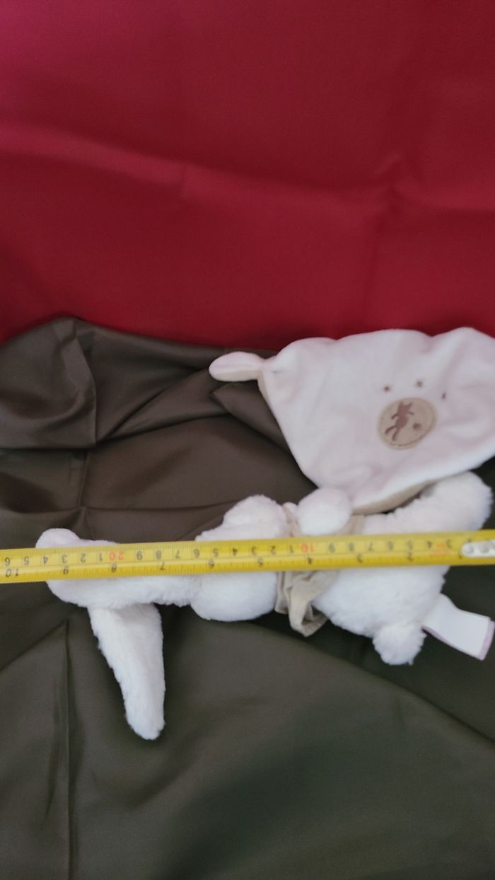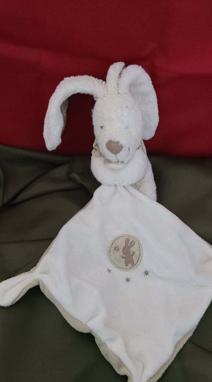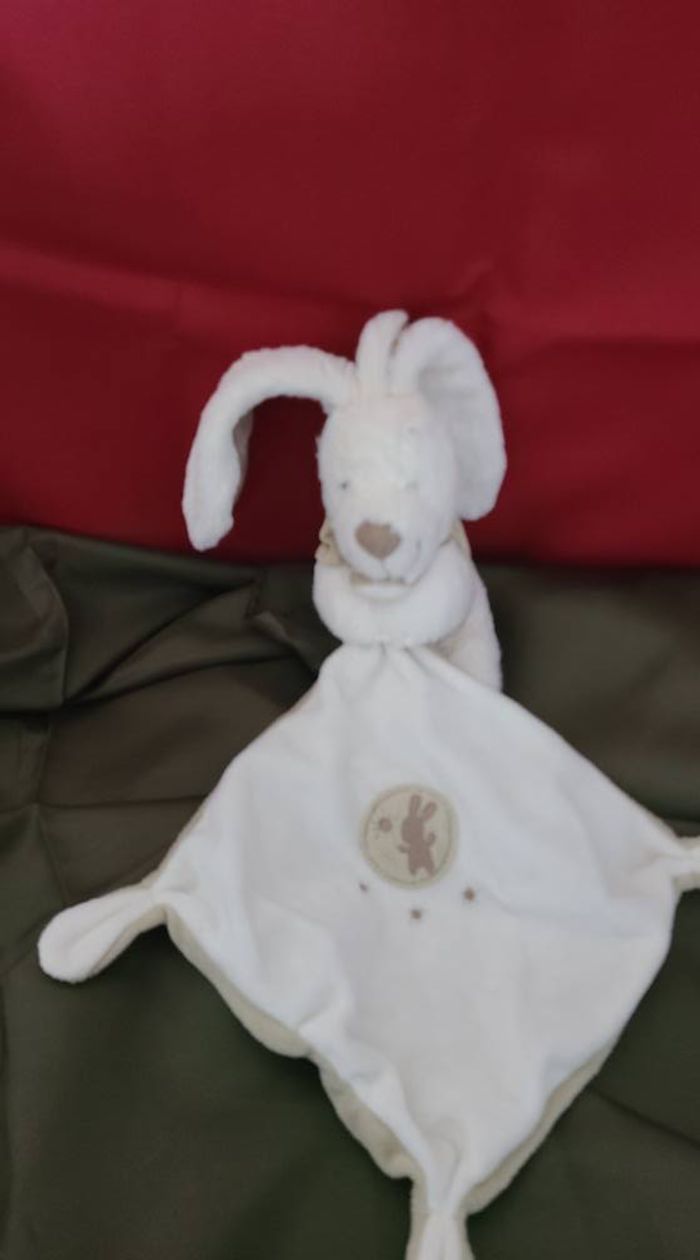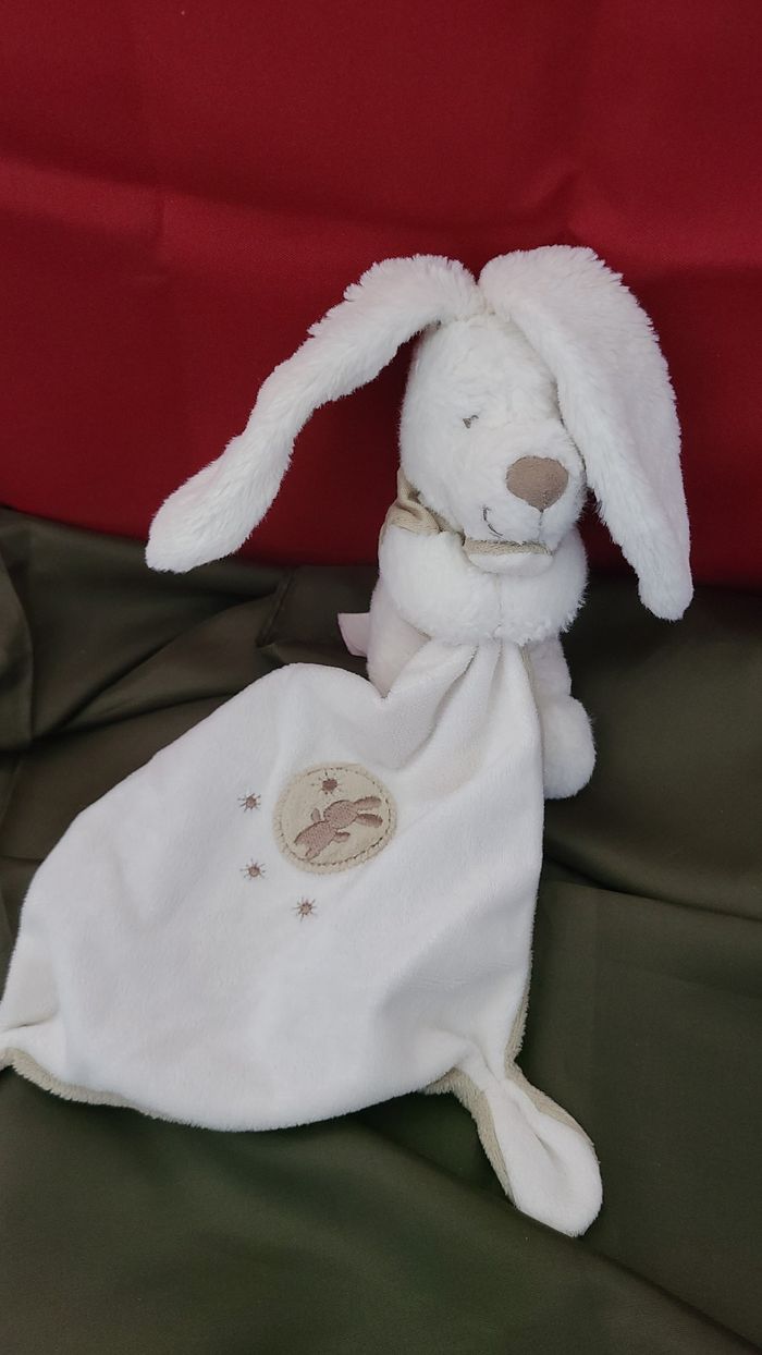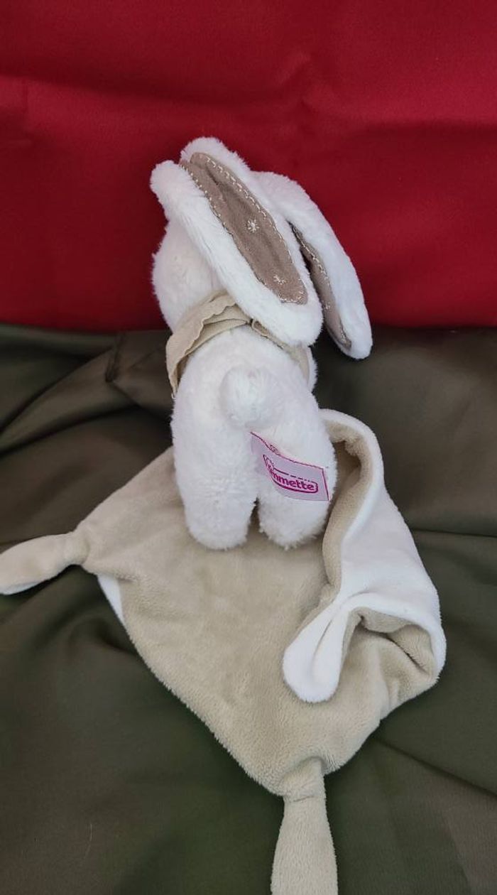 Lapin POMMETTE doudou blanc et beige avec mouchoir