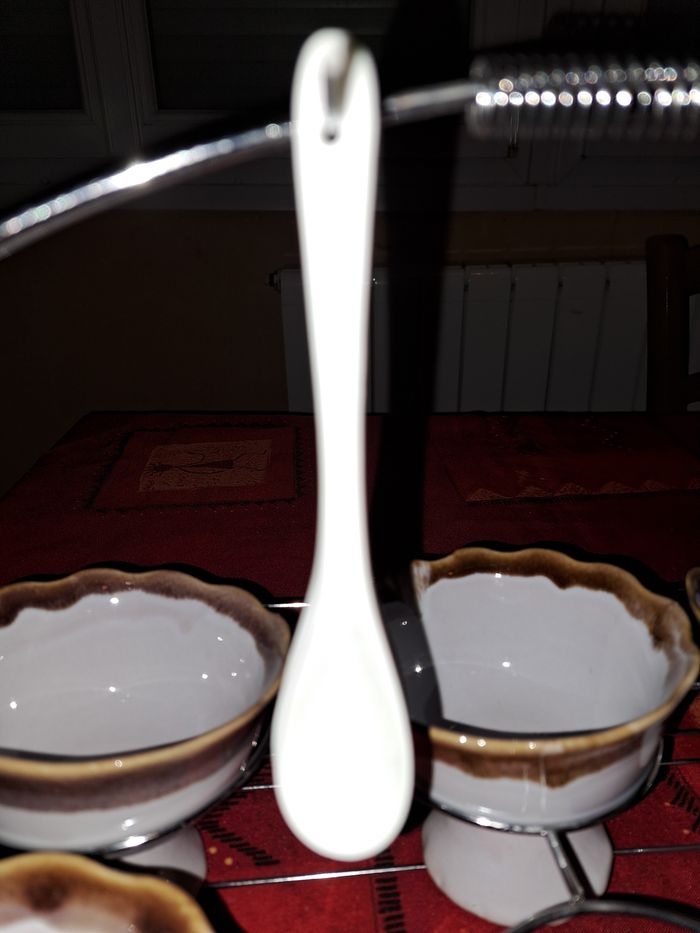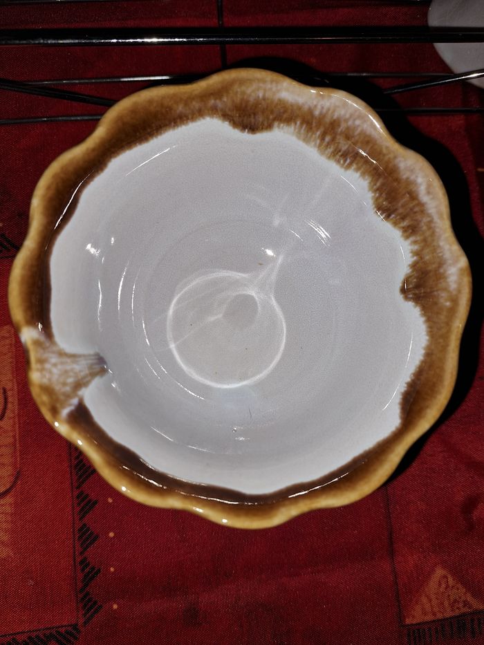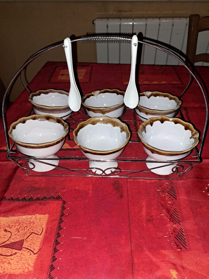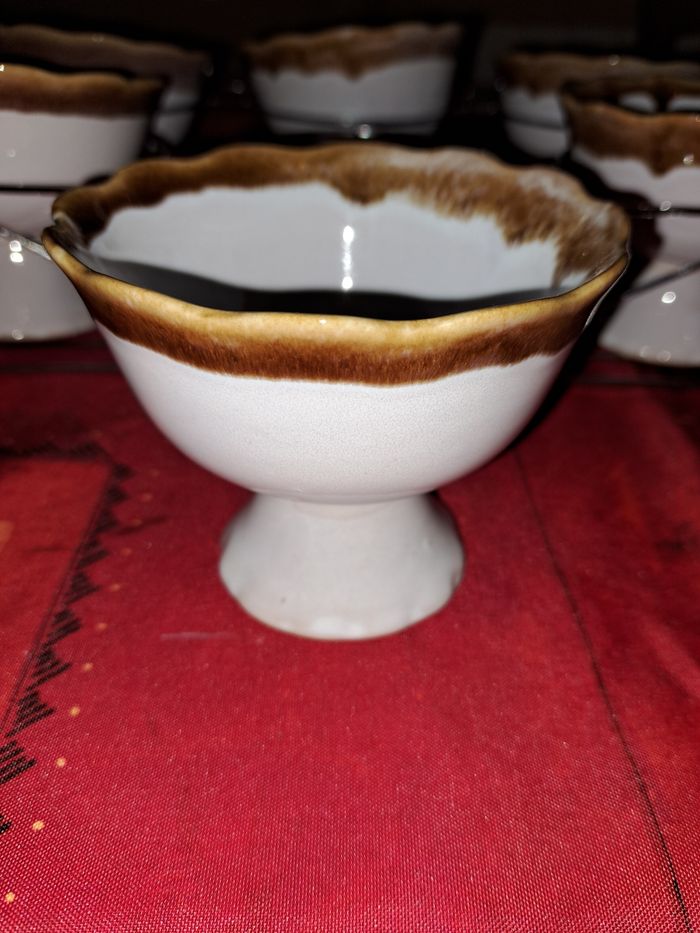 Lot de 6 coupes à glace à pieds Avec 5 cuillères Facile de rangement avec son plateau en acier Grande Contenance Hauteur 6 cm Diamètre 11 cm Profondeur environ 5 cm Couleur gris avec son bord marron Très bon état