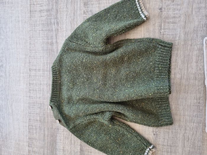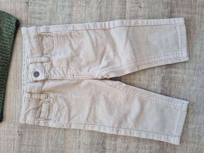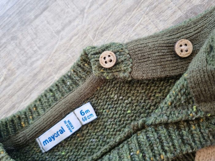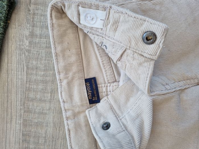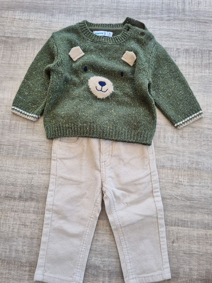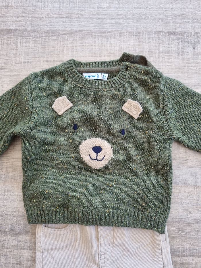 Ensemble pantalon et pull mayoral hiver 6mois. Un pantalon en velours beige et un pull vert sapin avec motif tête de nounours 🐻.
