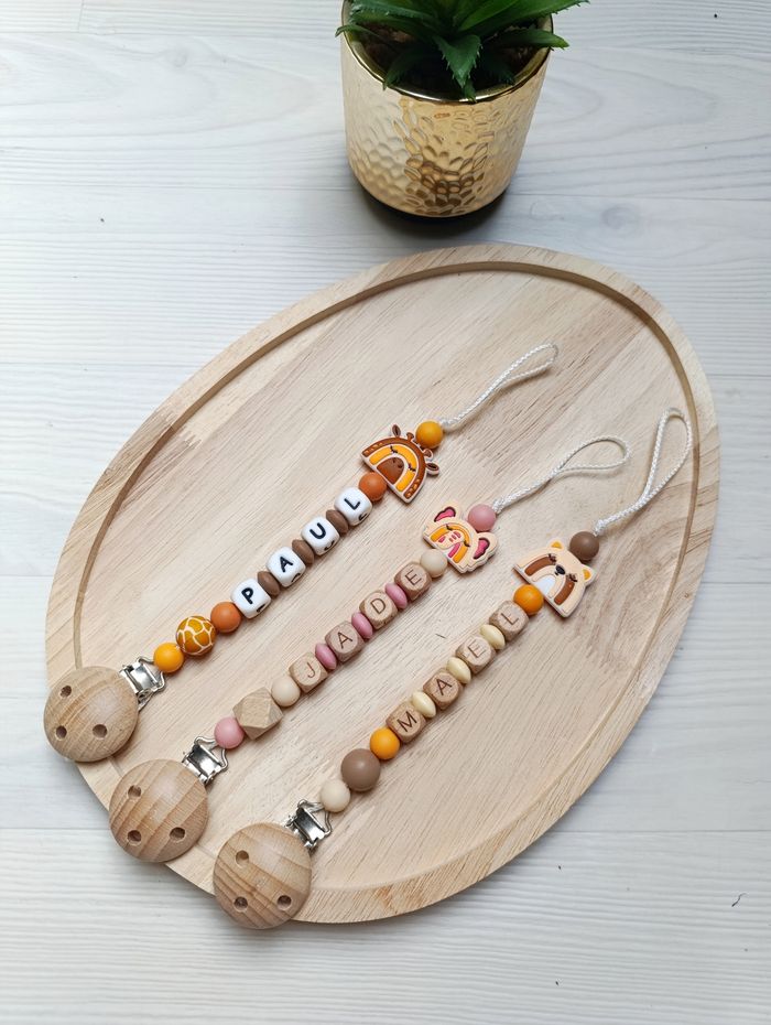 Attache tétine personnalisée Bois naturel et Silicone alimentaire Sans BPA ni autres substances toxique Différents coloris possibles