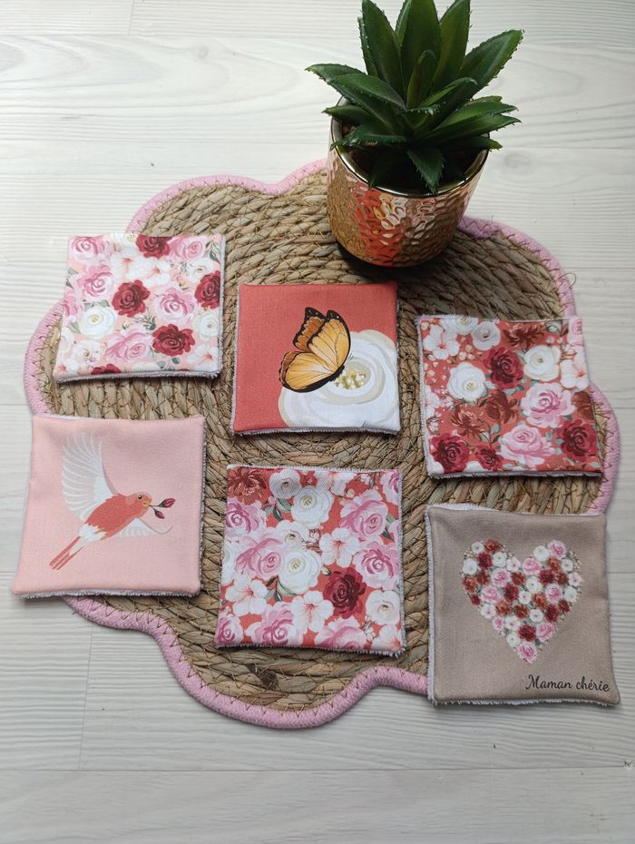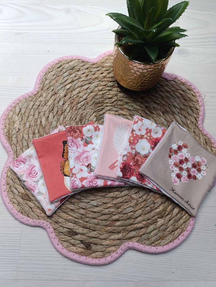 Lot de 6 lingettes lavables "Fête des mères" Coton et éponge bambou 10x10 cm Différents modèles au choix