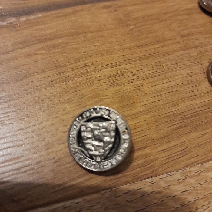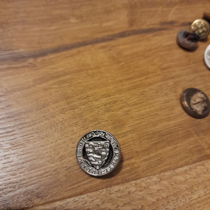 Bouton vintage argenté blason lion et inscription sur le tour.