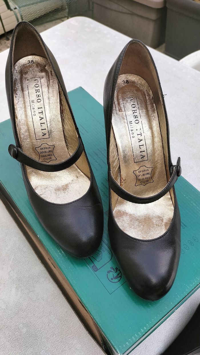Escarpins cuir noir très bon état, très peu porté,t38,talon fin 10cm .marque Corso Italia Milan