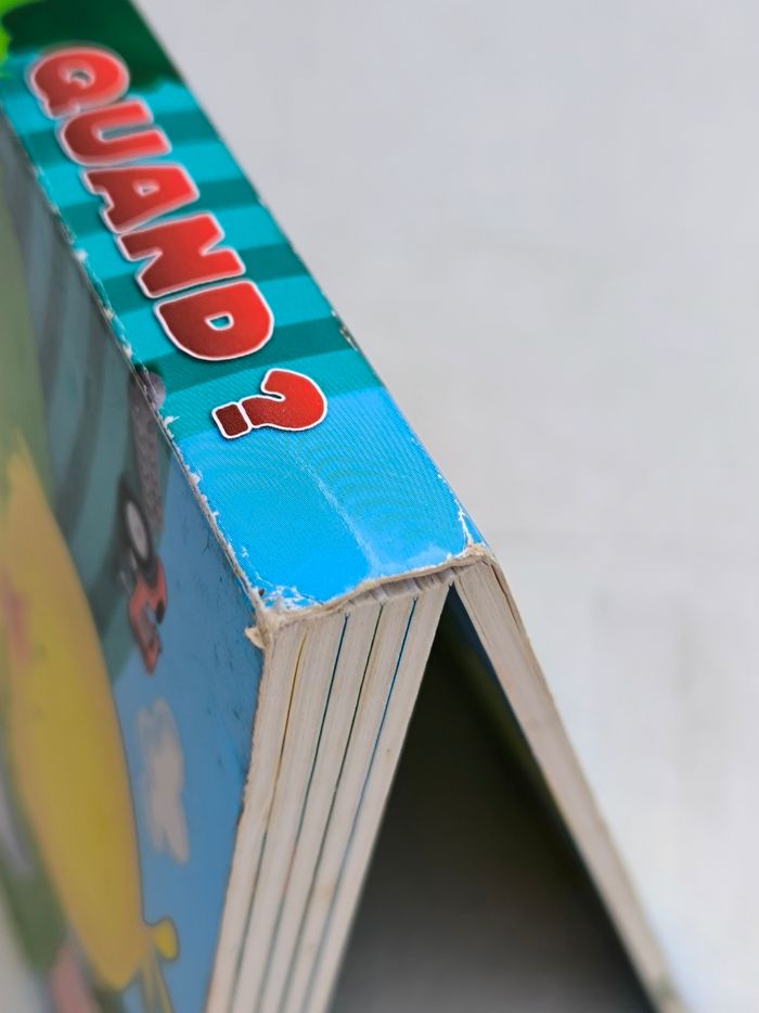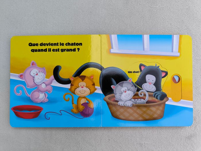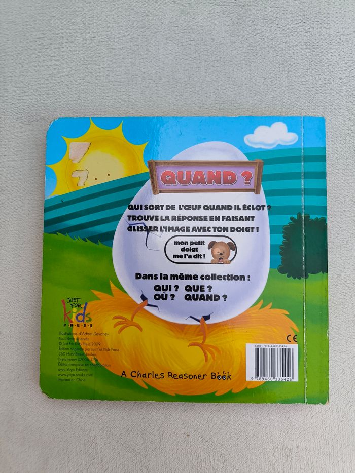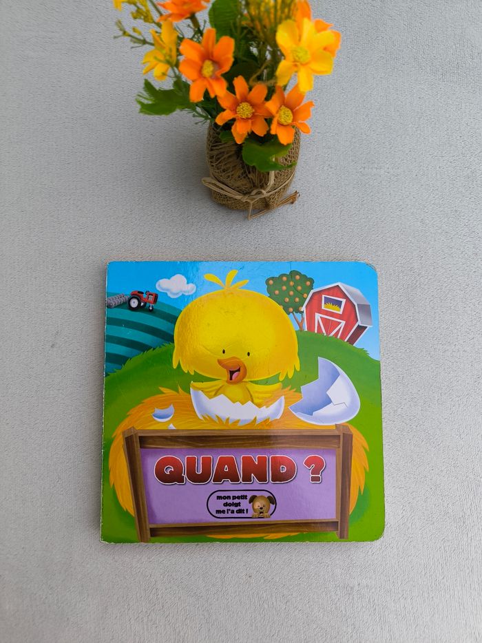 Livre animé Quand ? Éditions Just For Kids • Pages cartonnées • Animaux et bébés animaux -> Chaton/Chat -> Chiot/Chien -> Chenille/Papillon -> Têtard/Grenouille -> Poussin • Intérieur du livre en très bon état • Coins légèrement abîmés, bords livre jaunis En très bon état #evelyne_livres