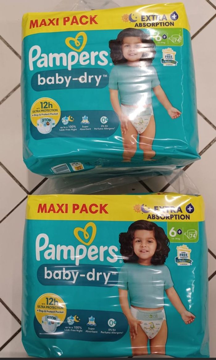 Couches Pampers baby-dry Taille 6+ / 14 à 19kg carton de 74 couches Lot de 2 cartons