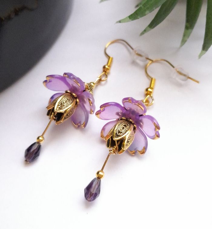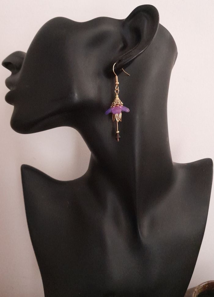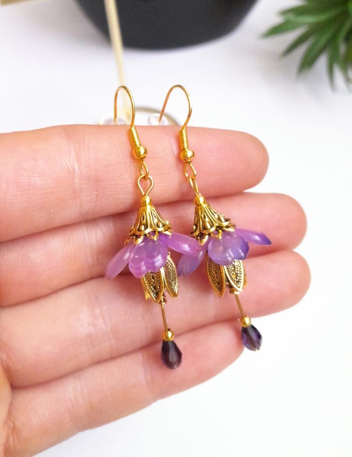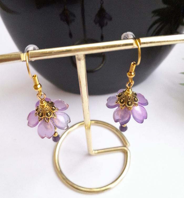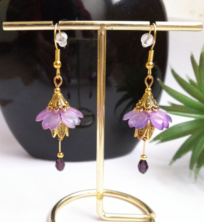 Boucles d'oreilles pendantes dorées inspirations asiatiques Ces boucles sont inspirées des fleurs trompettes clochettes. Perles pétales roses et perles de verres violettes. Longueur environ 5 cm. Peuvent convenir pour un mariage, demoiselle d'honneur, baptême cérémonie ou aux styles féeriques fantasy fairy elfiques. Dans le cas d'un mariage, si vous avez besoin de plusieurs paires pour les tenues assorties de vos demoiselles d'honneur, n'hésitez pas à me contacter. Accessoires bijoux femmes idées cadeaux original hippie bohème chic nature ethnique Asie asiatique chine