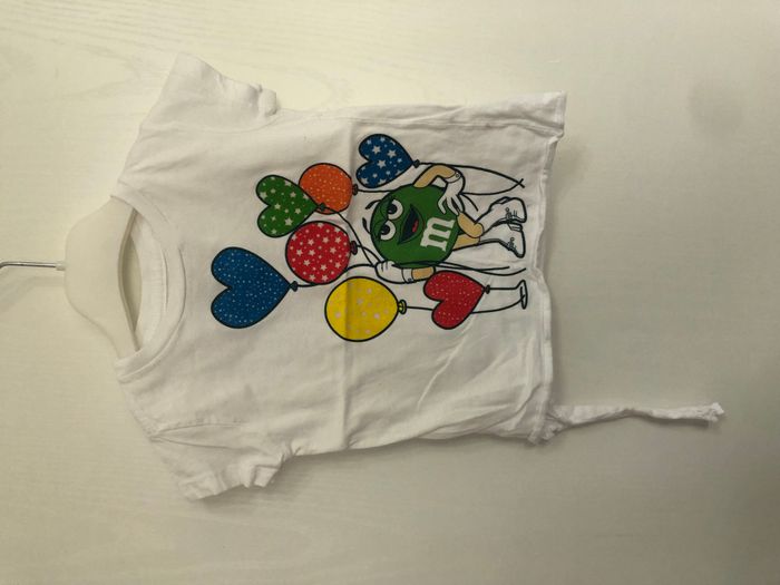 Très joli haut fille, manches courtes, acheté au M&M's strore de Londres. 100% coton Motif Miss Green entourée de ballons colorés. Marque M&M's Taille 2-3ans