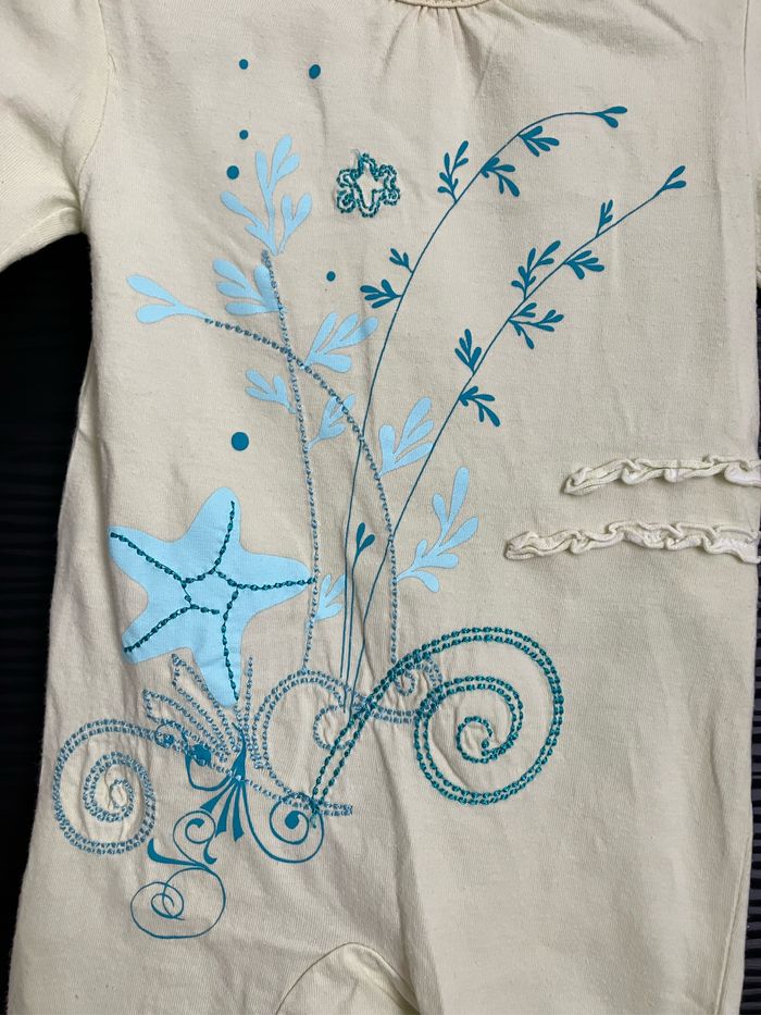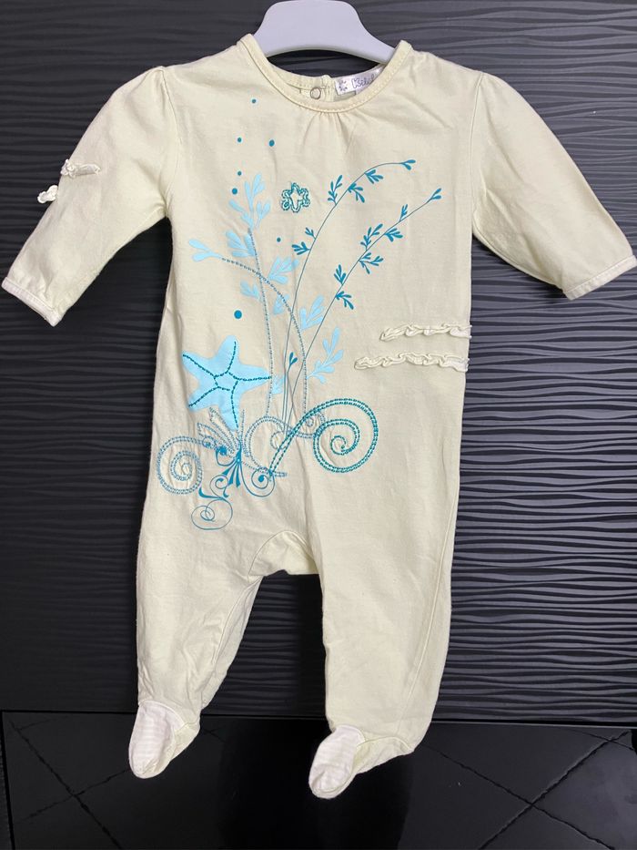 Pyjama une pièce à pieds jaune vert pale, avec boutons pression derrière, 100% coton, de marque Kitchoun (Kiabi), taille 6 mois État correct