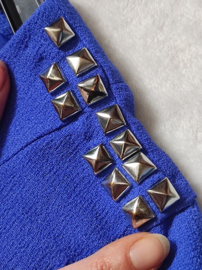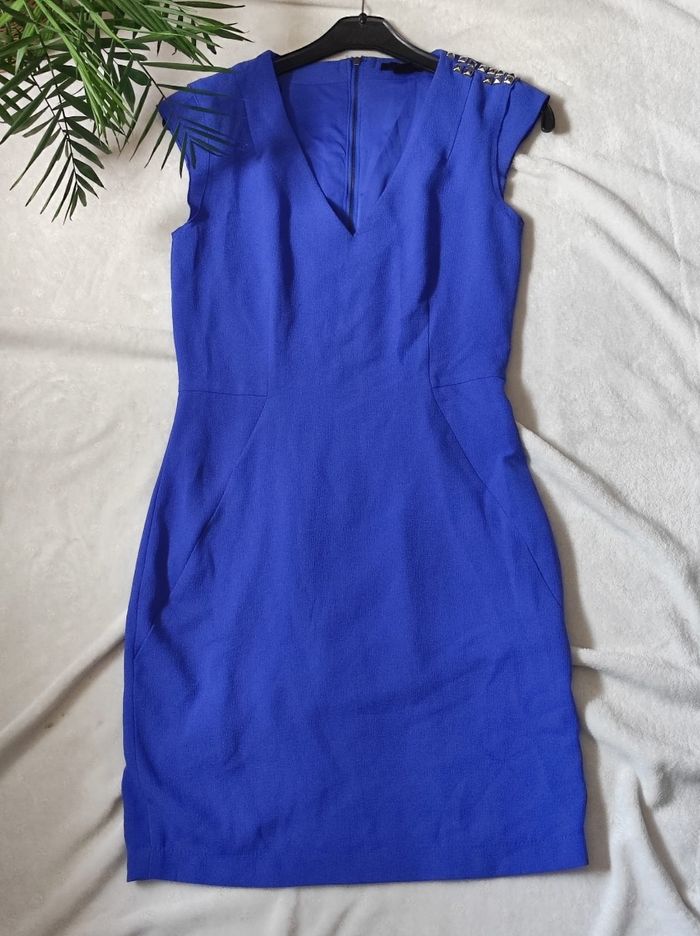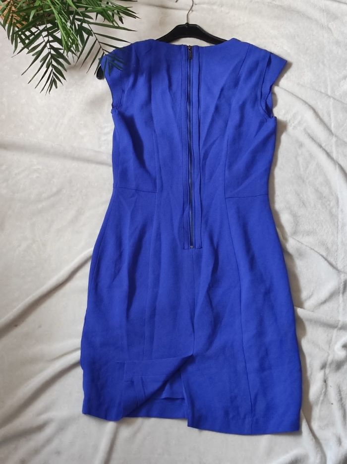 petite robe courte d'un bleu électrique, aux manches très courtes asymétriques. Coupe près du corps, fermeture éclair dans le dos. 2 petits accessoires décollé. Marque h&m en taille 36. A peine porté, en parfait état