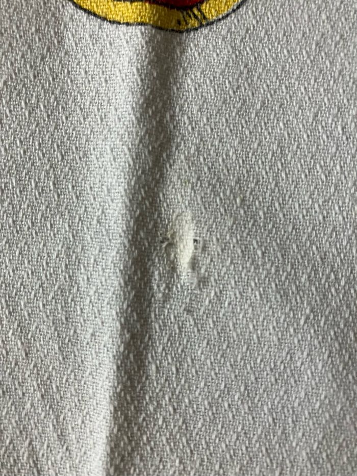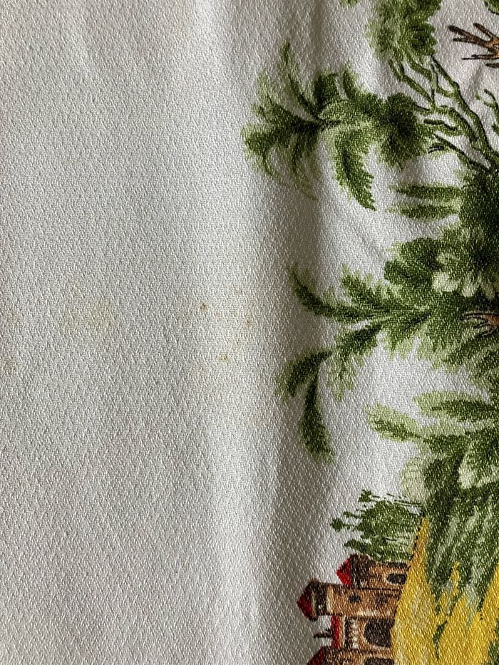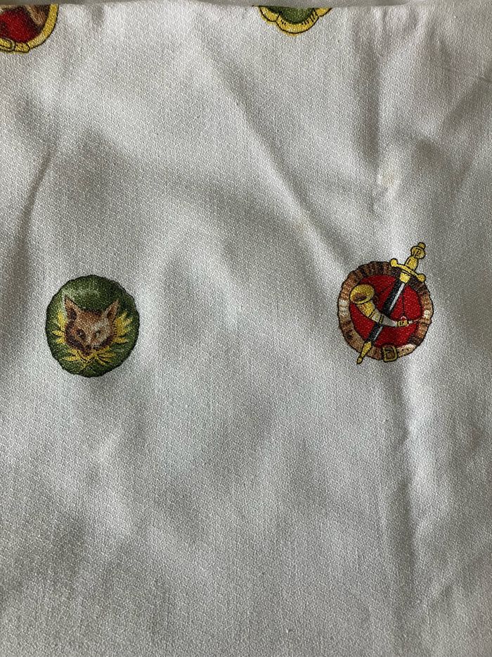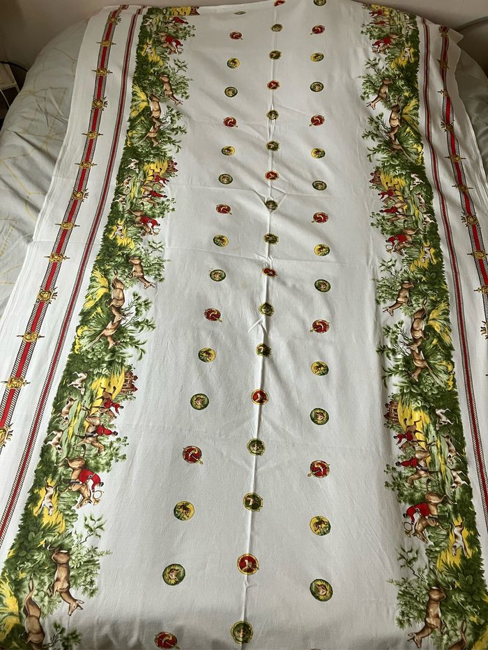 Cette nappe rectangulaire est vintage : elle porte les traces du temps : présence de taches (voir photos )et 2 endroits où le tissu est « accroché » (voir photos) Toutefois, elle peut être utilisée en tant que telle ou comme morceau de tissu. Motifs chasse à courre sur les bords et différents médaillons sur la partie centrale. Dimensions : - largeur: 135 cm - longueur : 220 cm