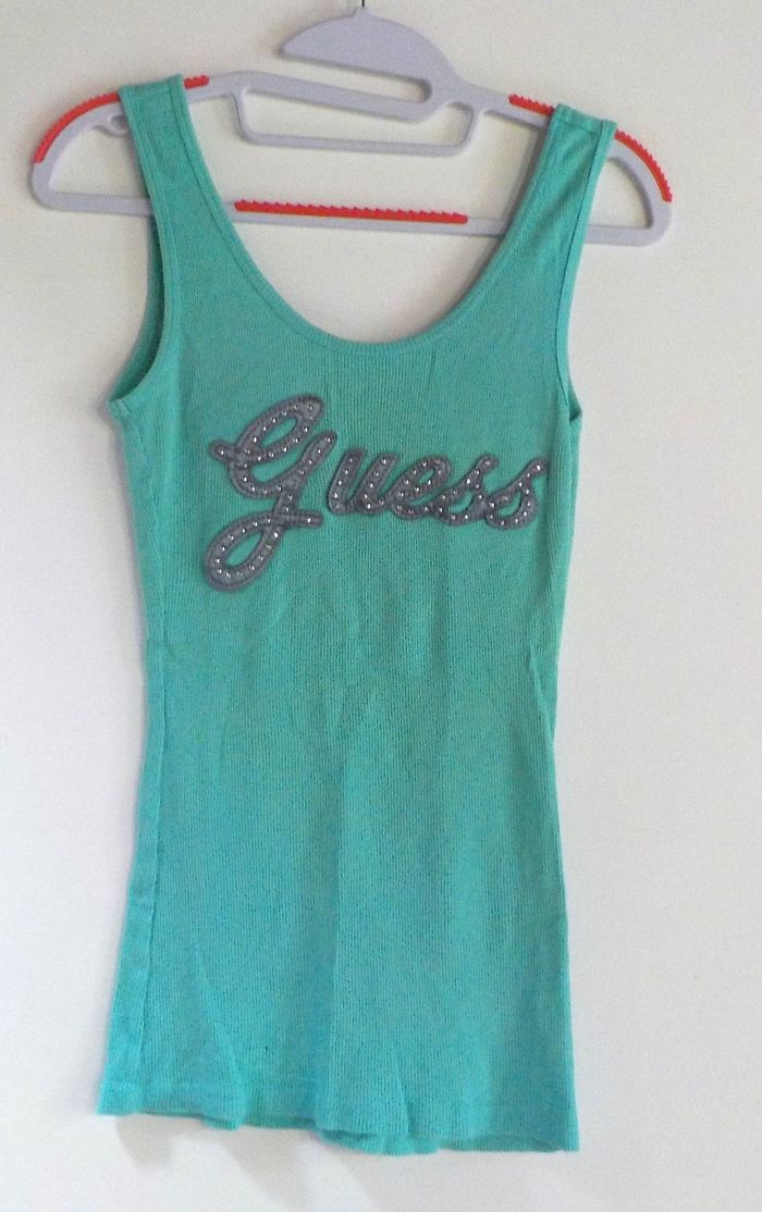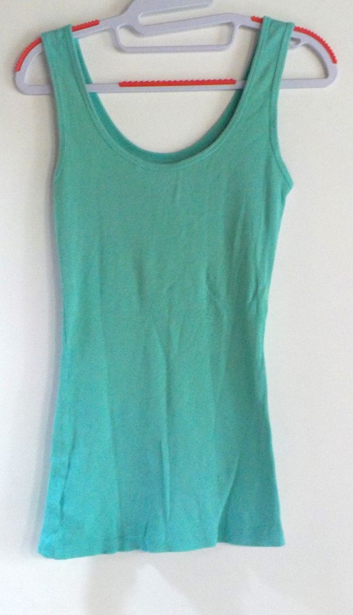 DEBARDEUR VERT INSCRIPTION SUR LE DEVANT Taille 32 (Merci de vous référer aux mesures ci-dessous) bon état Merci de vous référer aux mesures ci-dessous Largeur poitrine : 32 cm Largeur taille : 27 cm Longueur aisselles/bas du débardeur : 49 cm