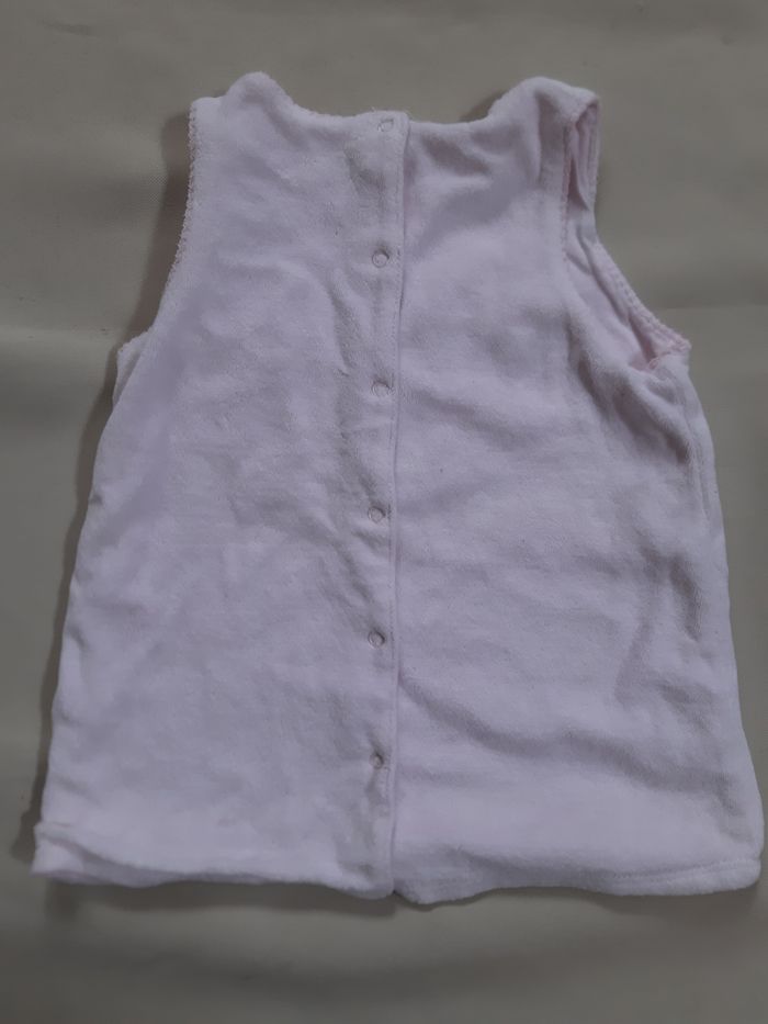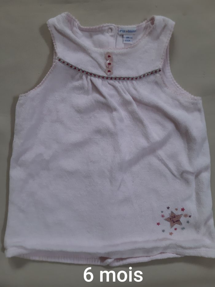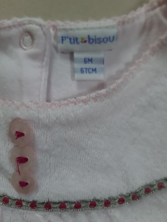 robe rose clair sans manches, de la marque p'tit bisou, en taille 6 mois en velours tout doux motifs : étoiles entièrement boutonnée dans le dos (boutons pressions) donc facile à enfiler En excellent état.