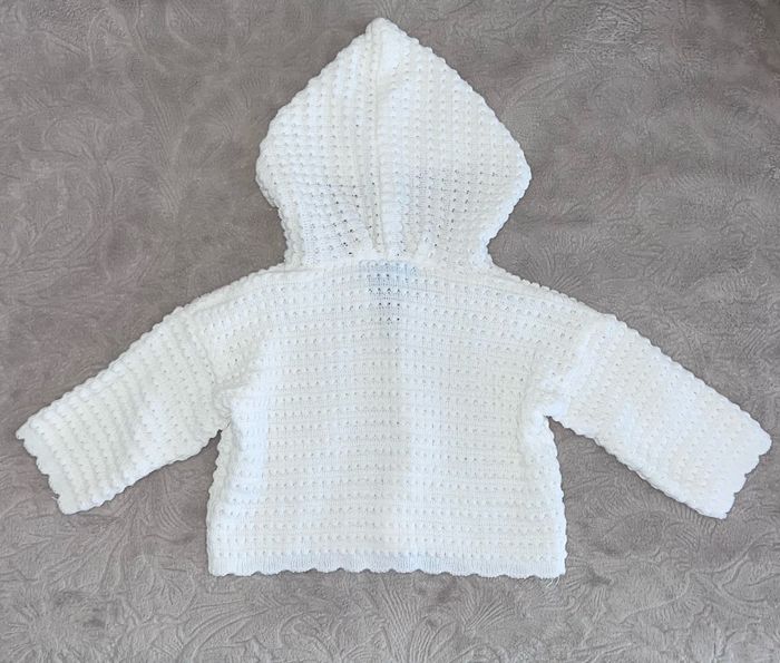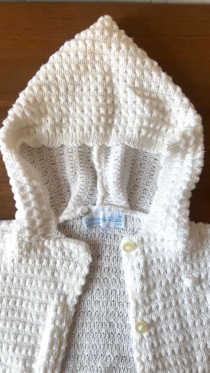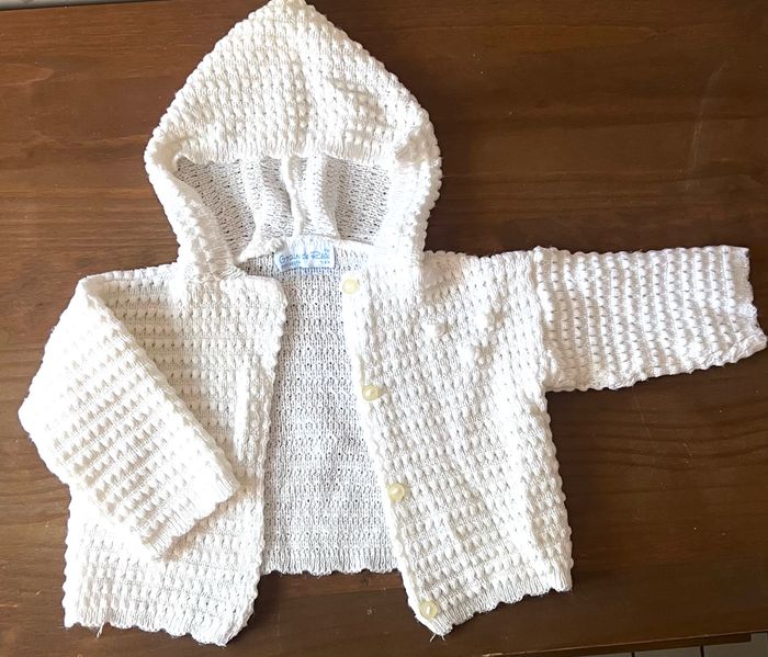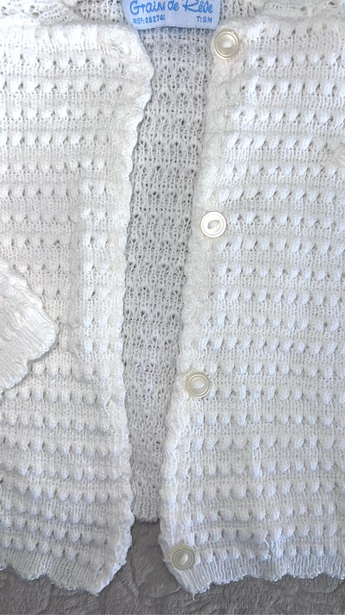 Gilet bébé à capuche Grain de rêve 6 mois unisexe peut convenir également à un bébé garçon En acrylique Coloris blanc Il faut faire le passage des boutons, je n'ai jamais utilisé le gilet (juste rangé) Maison non fumeur et sans animaux 📩Je réponds rapidement aux messages 📦Envoi rapide et soigné