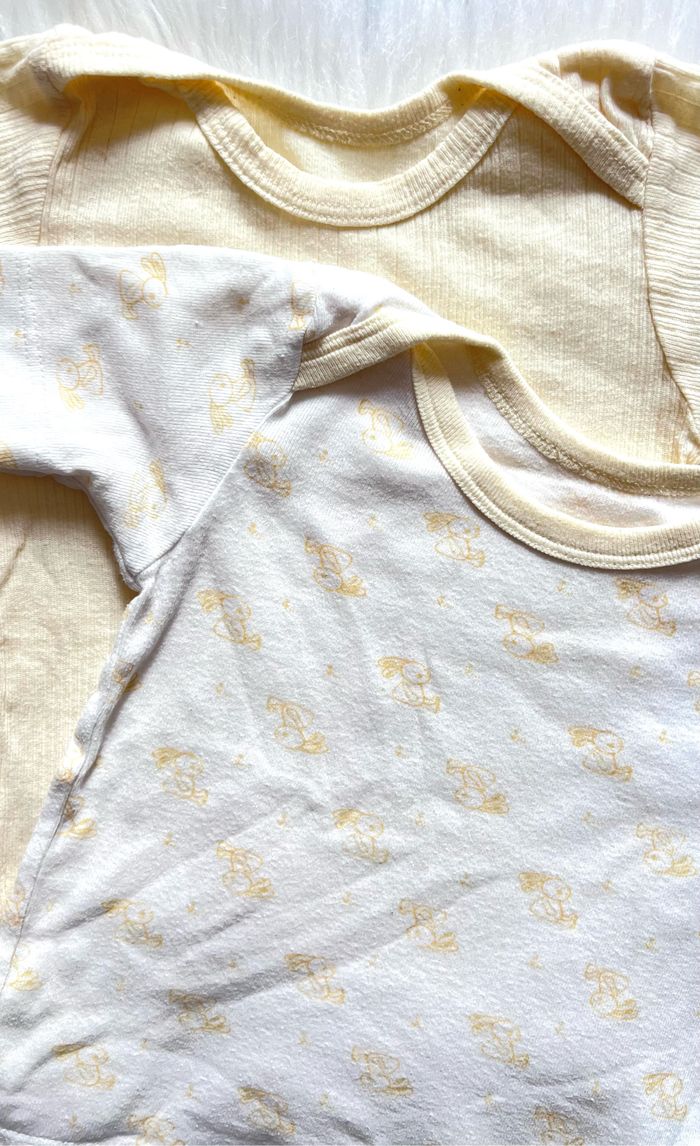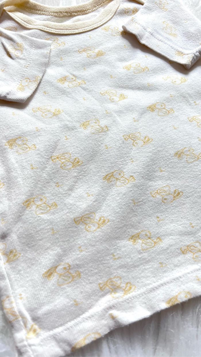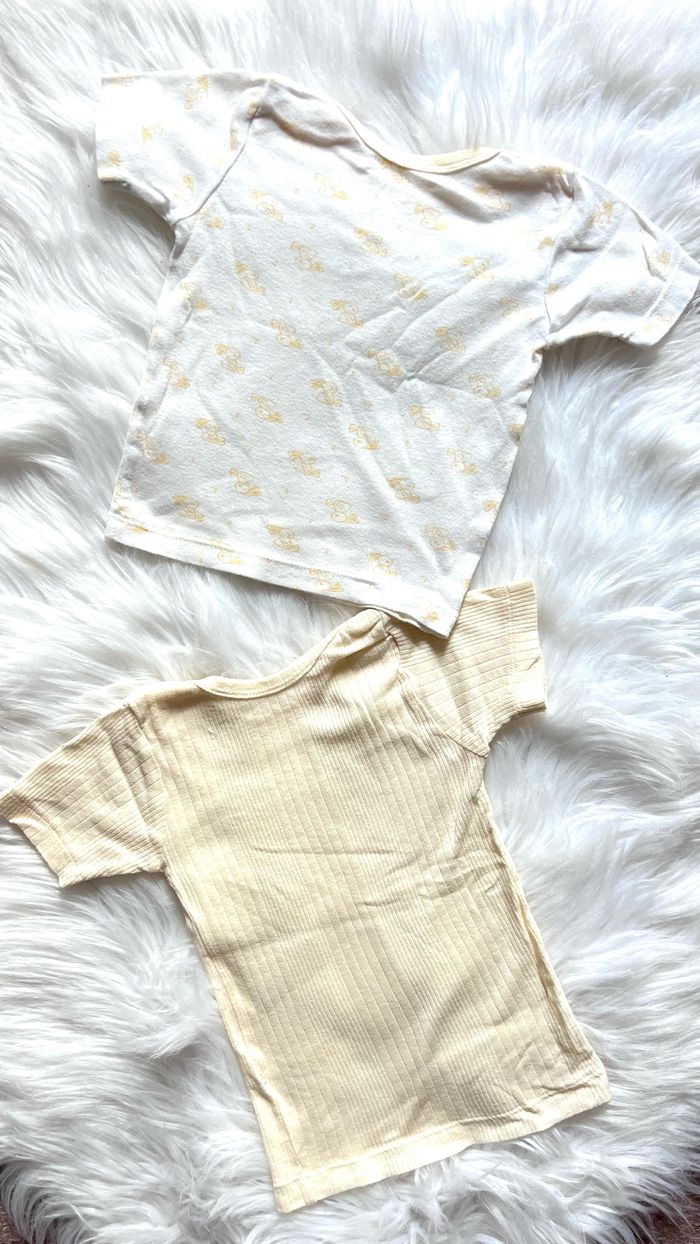 Deux t-shirts, sous pull, pyjamas en coton 12 mois Un blanc et jaune Un jaune (légère retouche couture sur le côté, à été un peu décousu en enlevant l'étiquette) Pas d'étiquette Maison non fumeur et sans animaux Je vends d'autres vêtements 12 mois à petits prix 📩Je réponds rapidement aux messages 📦Envoi rapide et soigné