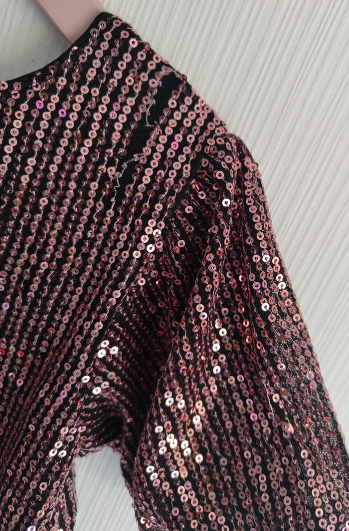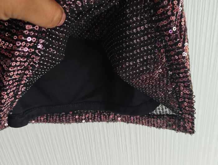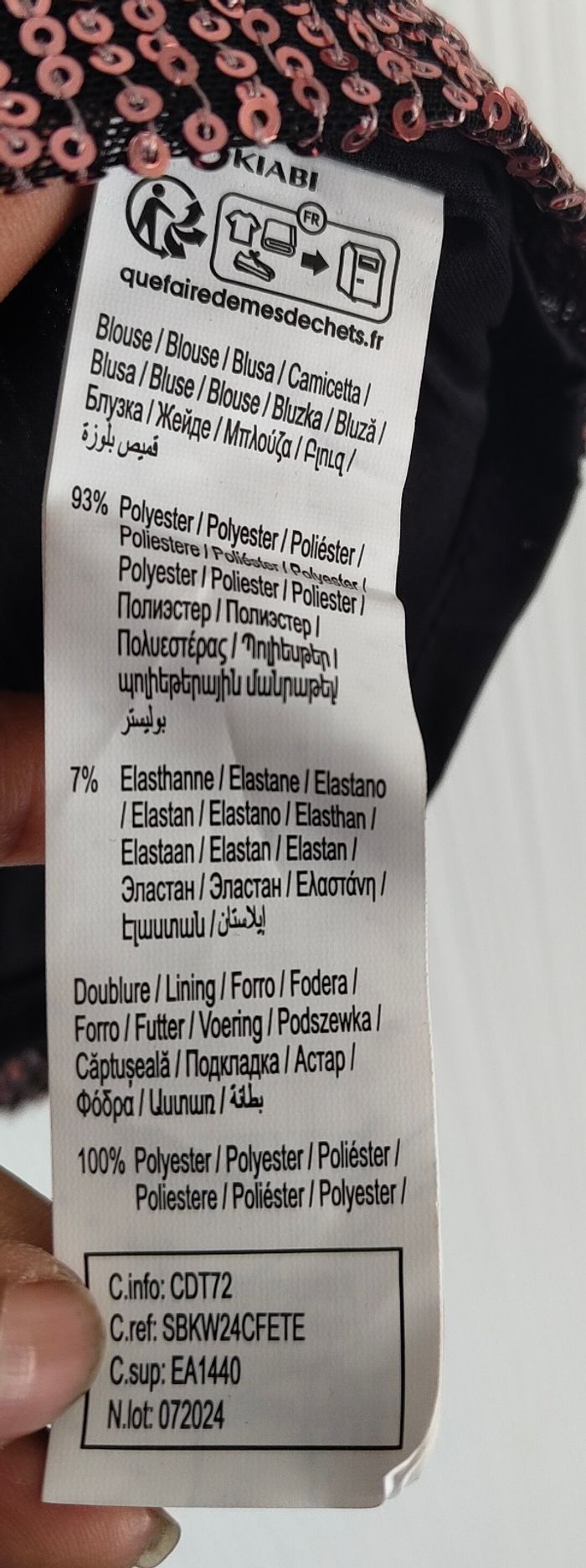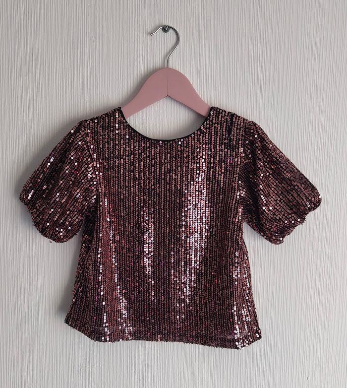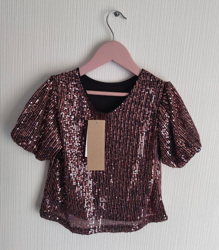 👧 T-shirt Blouse sequins à manches courtes. Col rond à l'avant et col v à l'arrière. Doublée. 👧 Taille 4 ans 👧 Marque : Kiabi 👧 Neuf avec étiquette. Défaut d'origine voir photo.