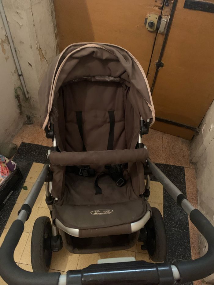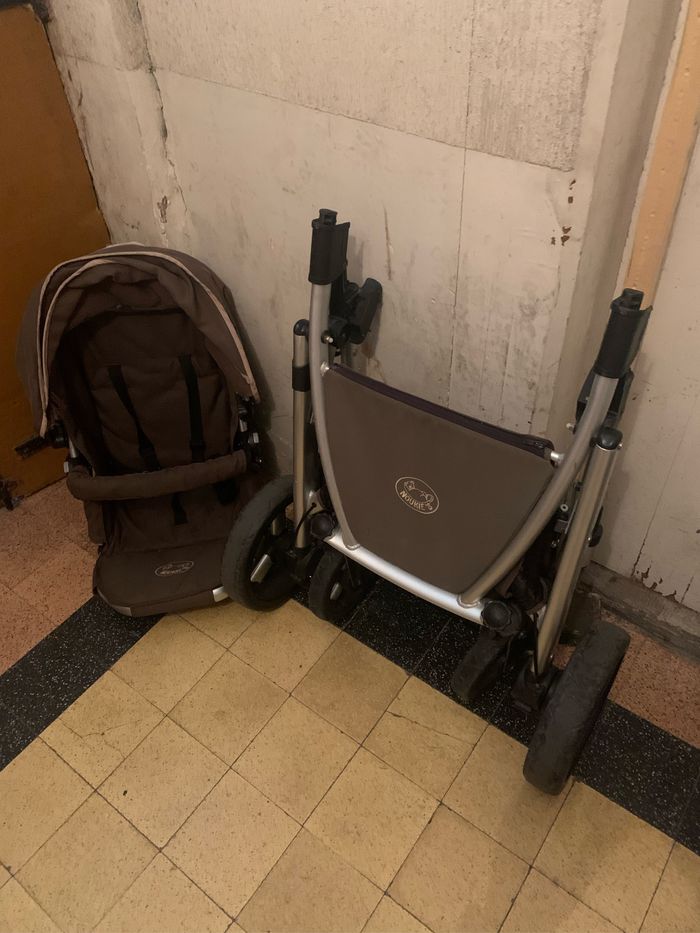 Pousette d’occasion légèrement abîmé sur l’abris du dessus mais encore en bon états
