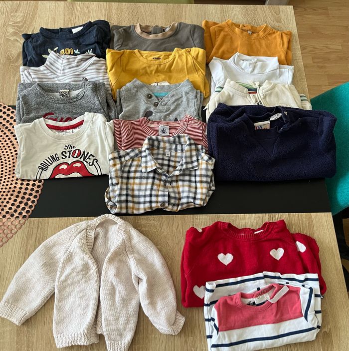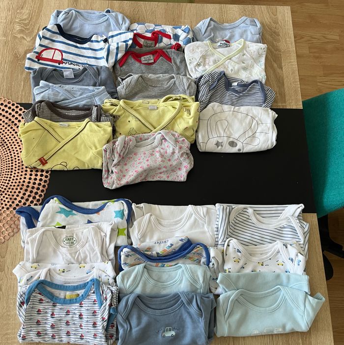 Le lot se compose : -14 bodies manches longues - 1 bodies manches longues fille - 11 bodies manches courtes -6 pyjamas -2 pyjamas fille - 13 tee shirt manches longues - 2 tee shirt manches longues fille - 1 gilet mixte - 5 pantalons -1 grenouillère -2 brassières naissance - 2 tee shirt manches courtes fille - 1 short mixte - 2 manteau fille -1 doudoune sans manches - 1 gigoteuse avec les manches 0/3 mois - 2 gigoteuse d’été 0/6mois - 1 gigoteuse d’hiver TU Les affaires sont comme neufs. C’est du 3 mois Plusieurs marques kiabi, tape à l’œil,verbaudet,petit bateau, orchestra etc ….. N’hésitez pas de m’écrire en mp pour des infos 😉