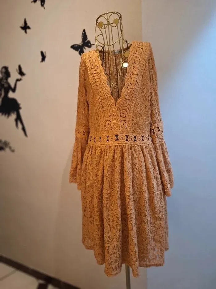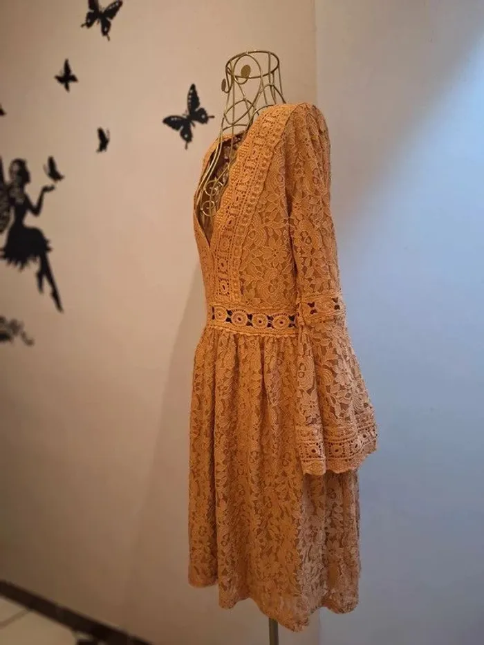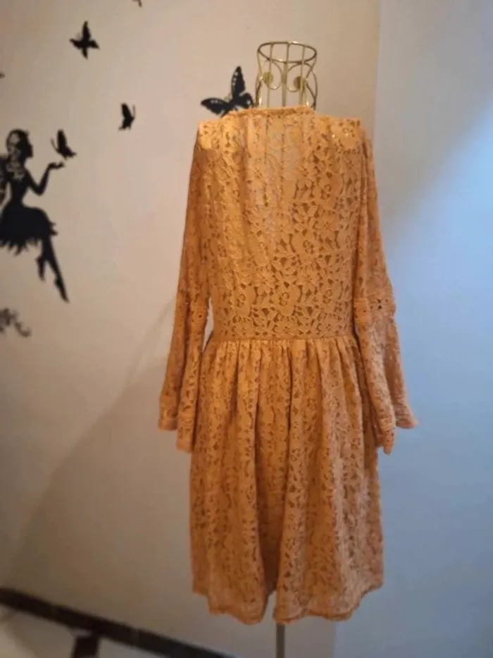 Robe dentelle moutarde - longueur 90 cm - doublée sauf aux manches et au dos - longues manches évasées & ajourées - taille élastique - taille S/M idéale pour les tailles 36 & 38 - état sans défaut ps : je ne fais pas de photo portée #robedentelle