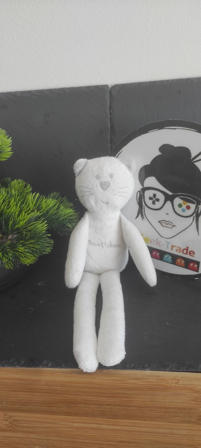 Doudou Chat peluche bout'chou monoprix blanc coeur gris moustache Triangle