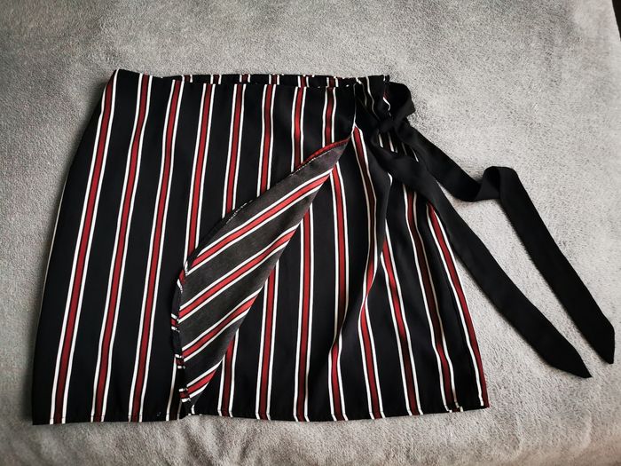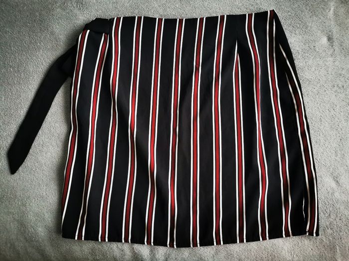 Jupe porte feuille rayée Kiabi taille 42, fluide et légère, tirette et ceinture à nouée sur le côté, environ 47cm de longueur.
