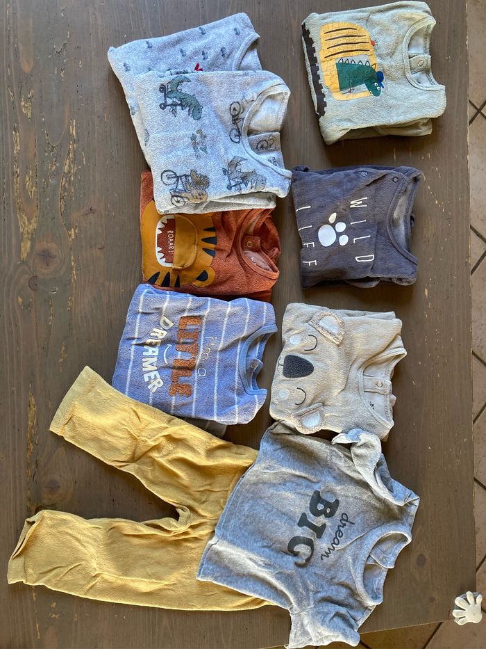Lot vêtements bébé garçon 18 mois : - 7 combi-pyjamas Kiabi - 2 ensembles pyjamas - 7 bodys manches longues - 7 bodys manches courtes - 4 joggings - 2 leggings - 7 tee-shirts manches longues - 1 combinaison Tex - 3 vestes capuches à zip - 2 vestes en laine à zip - 1 pull capuche marin - 1 gilet - 2 sweats - 1 ensemble Sergent Major - 1 doudoune kaki Kiabi