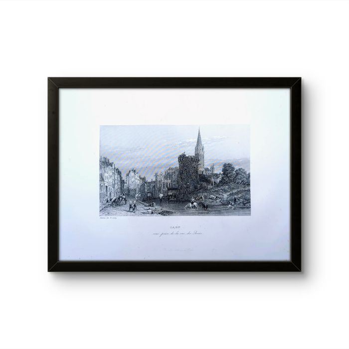 Imprimée en 1844, Caen la rue des quais, Vintage Authentique (cadre non inclus )