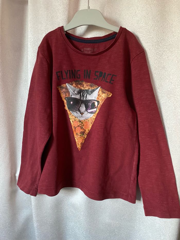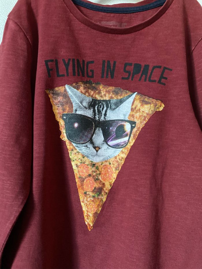 T-shirt bordeaux imprimé chat avec lunettes Flying in Space Manches longues Taille 8 ans 128 cm 100% coton Orchestra