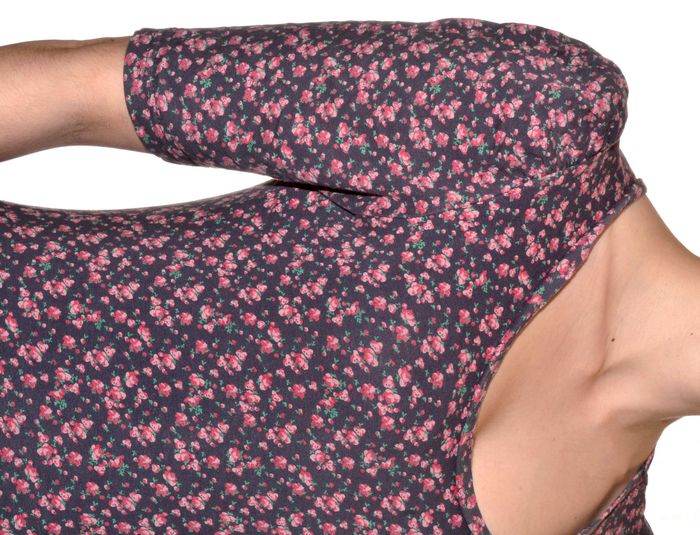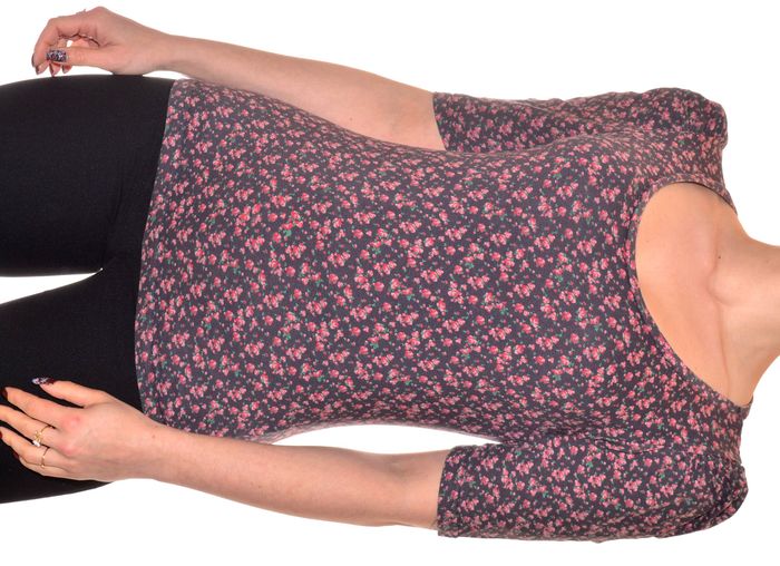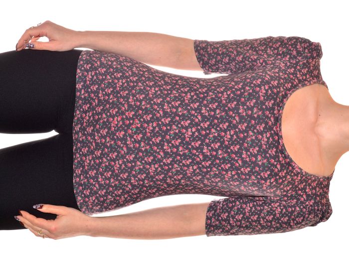 joli tshirt ajusté manches 2/4 col rond épaules bouffantes violet motif floral rose taille S - photo numéro 4