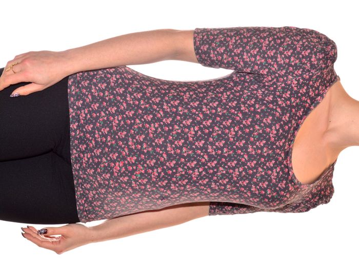 joli tshirt ajusté manches 2/4 col rond épaules bouffantes violet motif floral rose taille S - photo numéro 2