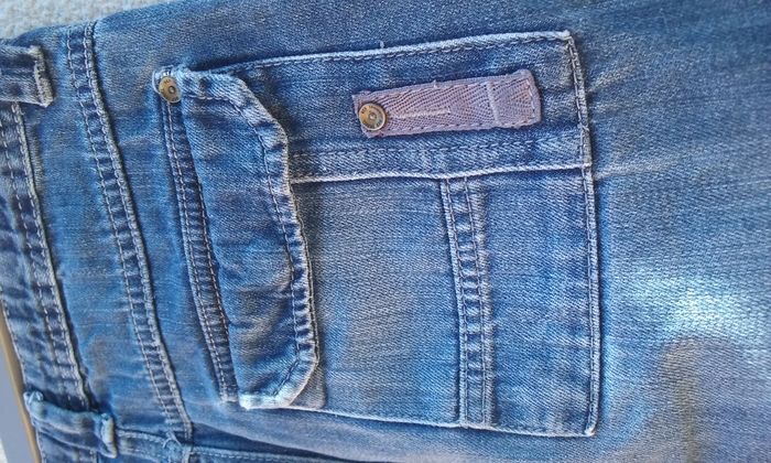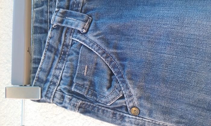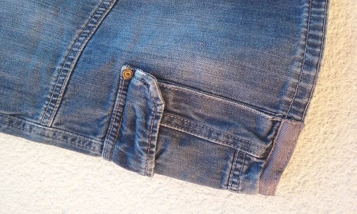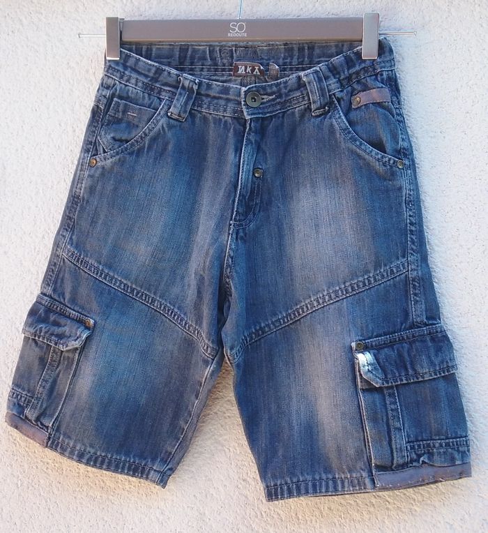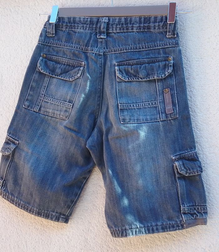 Short long en jeans bleu, fermeture boutonnée et zippée, taille réglable, 100% coton.