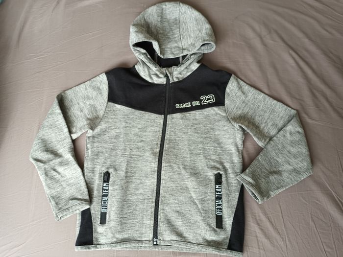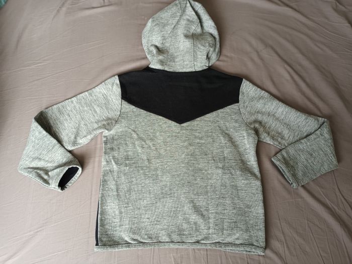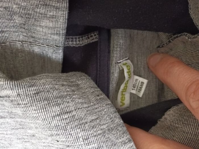 veste de sport grise et noire Marque : Vertbaudet Taille : 10 ans / 140 cm 56% coton, 36% polyester, 4% viscose, 4% élasthanne Ni trou ni tache, légère bouloches sur le tissu noir (voir photos)