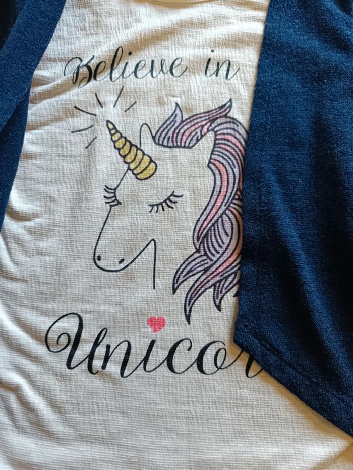 Haut LPC GIRLS Blanc avec impression licorne Effet superposition gilet bleu marine Manches longues 98% Polyester & 2% Elasthanne TAILLE 5 ANS TRES BON ETAT Allez voir mes autres ventes!