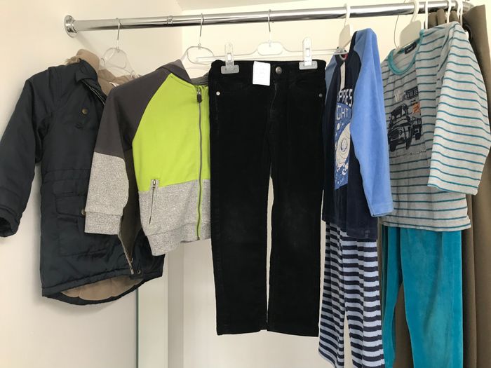 1 pyjama In extenso 1 pyjama Tissaïa 1 pantalon Orchestra 1 gilet Orchestra 1 blouson Kid Kanaï 1 tee-shirt Kiabi 1 chemise Basics 1 tee-shirt Lupilu 1 sweat H&M